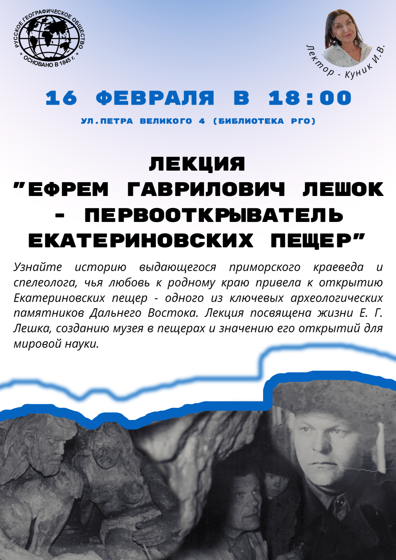 Лекция Ирины Куник «Ефрем Гаврилович Лешок - первооткрыватель Екатериновских пещер»