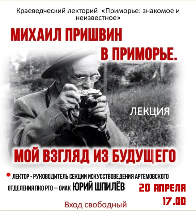 20 апреля 2026 года в лекционном зале ПКО РГО-ОИАК состоится лекция «Михаил Пришвин в Приморье. Мой взгляд из будущего» из краеведческого цикла «Приморье: знакомое и неизвестное», подготовленных Артёмовским местным отделением ПКО РГО - ОИАК. Её проведет Юрий Шпилёв, член Совета и руководитель секции искусствоведения Артёмовского МО. Он обладает уникальной исторической литературной коллекцией, связанной с жизнью и творчеством Михаила Пришвина.
