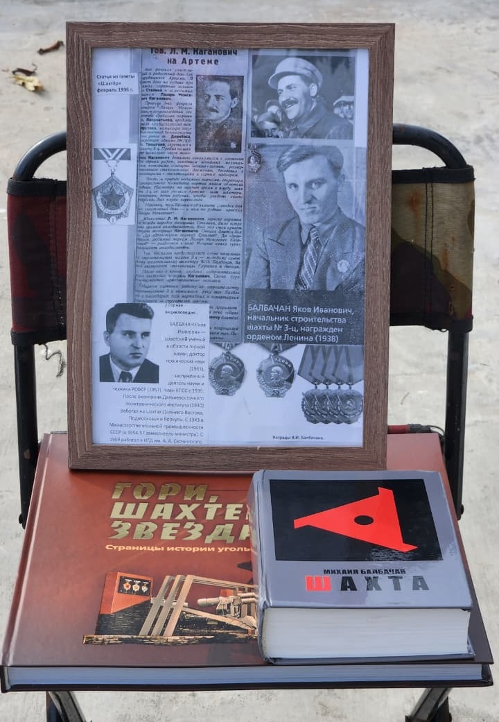 Книга «Гори, Шахтёрская звезда» и роман «Шахта» вместе с автобиографическими данными Я.И.Балбачана выставленная для ознакомления участников старта автопробега Артём-Москва.