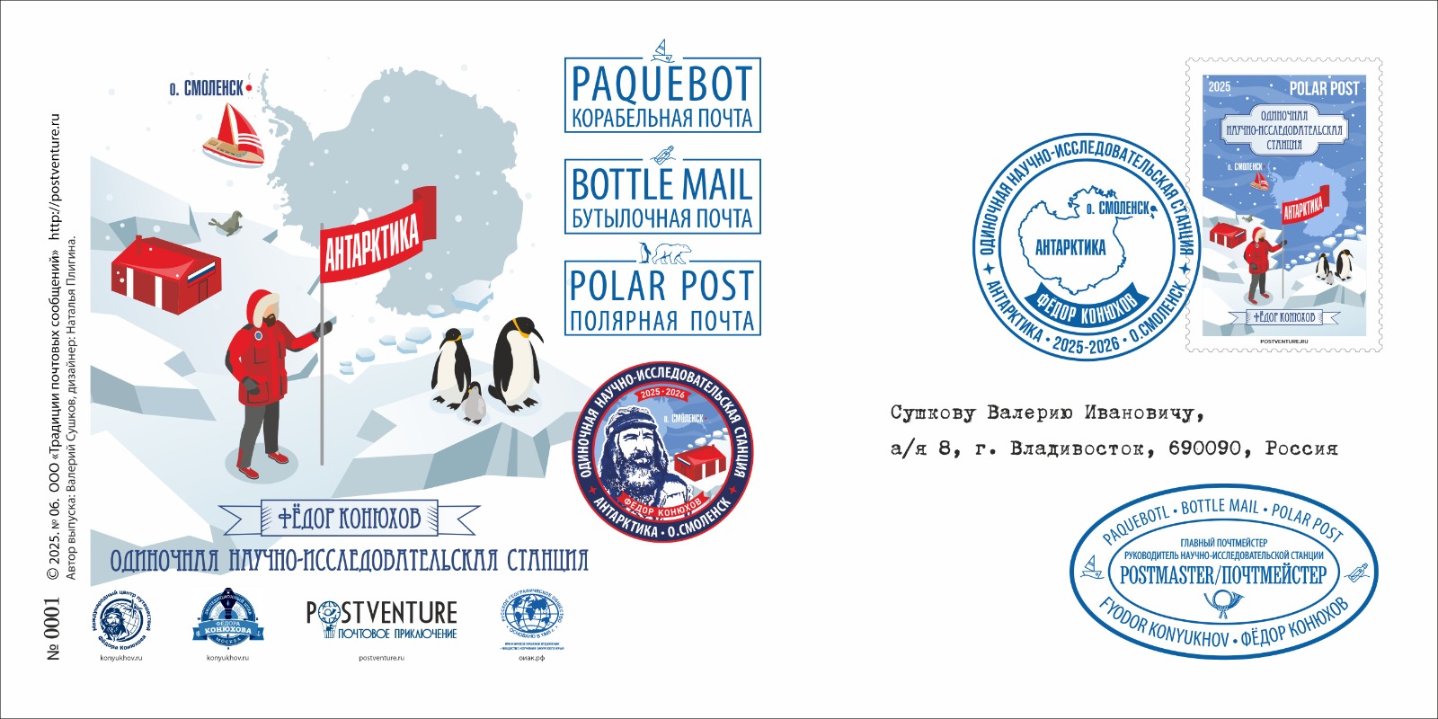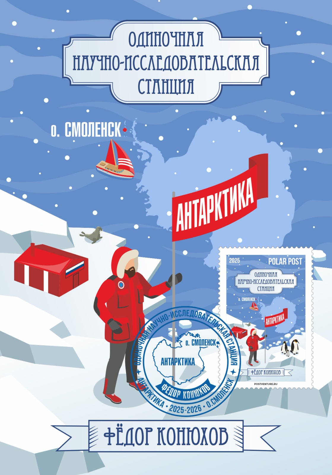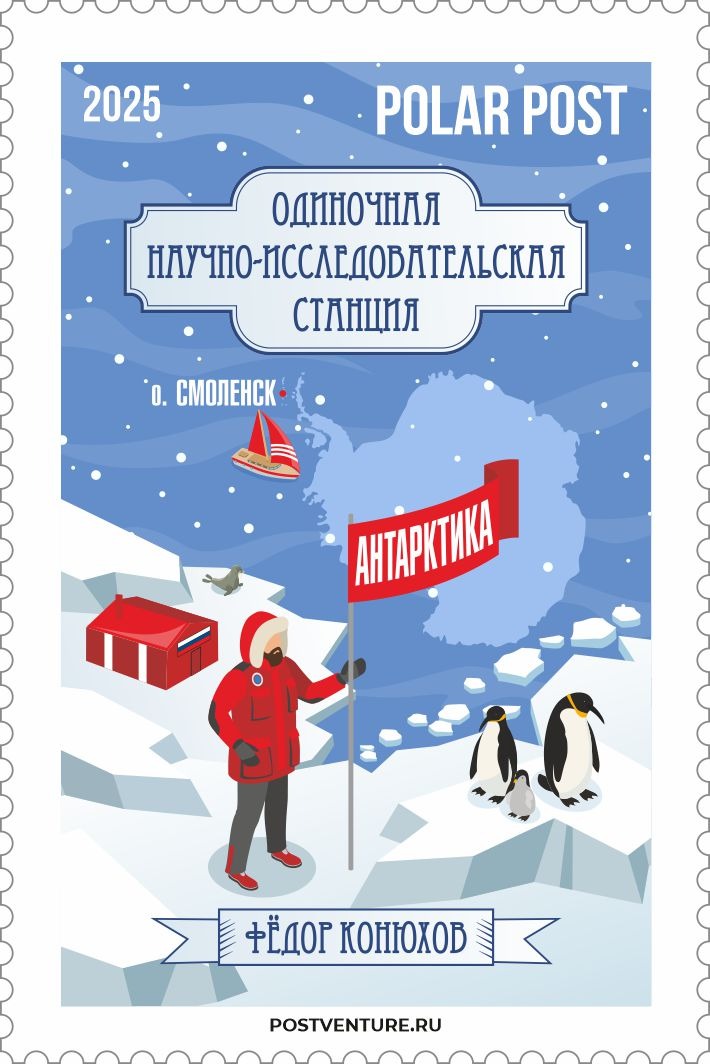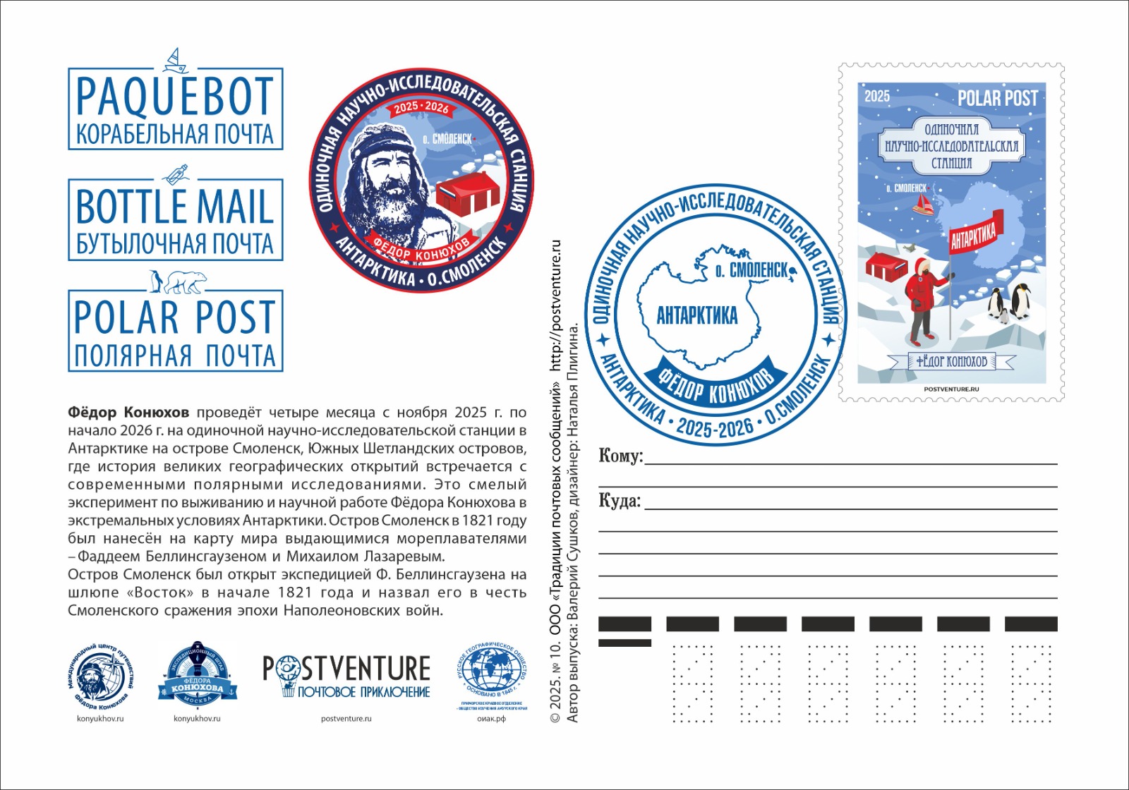 Автором и руководителем почтового выпуска «Одиночная антарктическая станция на острове Смоленск экспедиции Фёдора Конюхова» выступил руководитель Всероссийского проекта проекта развития филатуризма «POSTVENTURE & Почтовое приключение», исследователь-путешественник, историк почты, Валерий Сушков. Почтмейстером филателистического выпуска выступил сам Федор Конюхов. Дизайнер выпуска – Наталья Плигина.