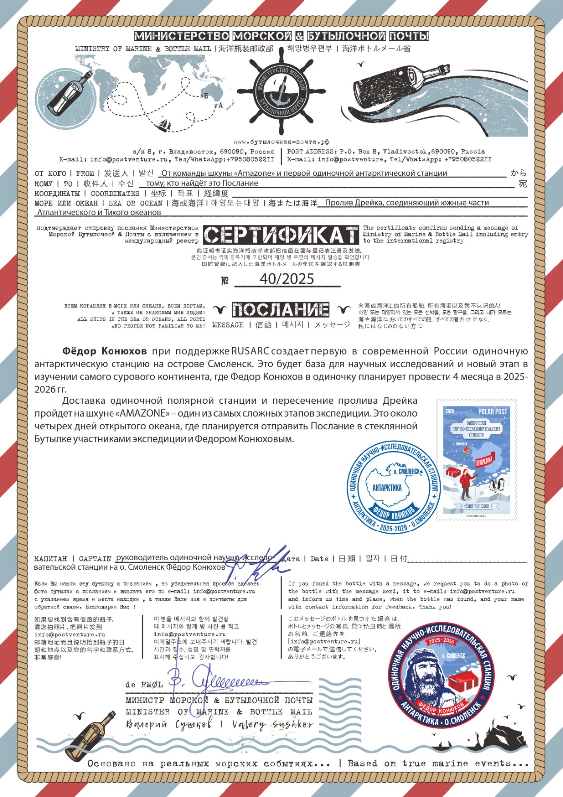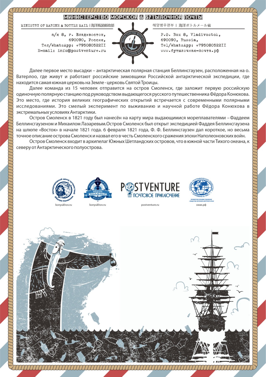 Почтовый набор «Одиночная антарктическая станция на острове Смоленск экспедиции Фёдора Конюхова», представленного «Корабельной почтой», «Бутылочной почтой» и «Полярной почтой», можно заказать по контактам Всероссийского проекта развития филатуризма «POSTVENTURE & Почтовое приключение»: E-mail: info@postventure.ru или по тел./WhatsApp: +7-950-805-22-11