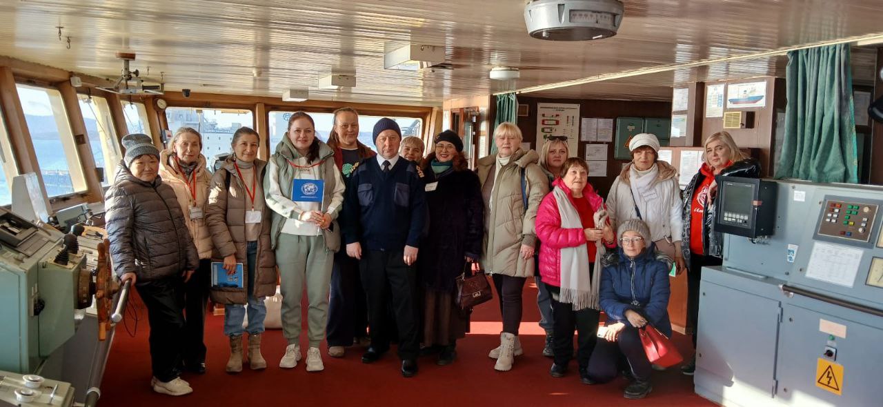 Капитан ледокола «Магадан» Рамис Закиров встречал экскурсоводов вместе со старшим помощником Игорем Валерьевичем и четвертым – Игорем Ильичём. После краткого инструктажа по технике безопасности (неукоснительное "правило трех опор!), гостей пригласили в кают-компанию, где их уже ждал старший механик (по-флотски «дед»), готовый раскрыть все тайны машинного отделения. Боцман демонстрировал действие "ласточки" – стального троса, вызволяющего на буксире суда из ледяного плена. Во время пребывания на борту ледокола, радушие команды ледокола искрилось, как северное сияние! Экскурсоводы узнали, что нос корабля зовется баком, корма – ютом, а судовой колокол, рында, носит гордое, почти военное имя – рындабуль. И ещё одно открытие ждало экскурсантов: привычный язык на колоколе превратился в баштовый конец.