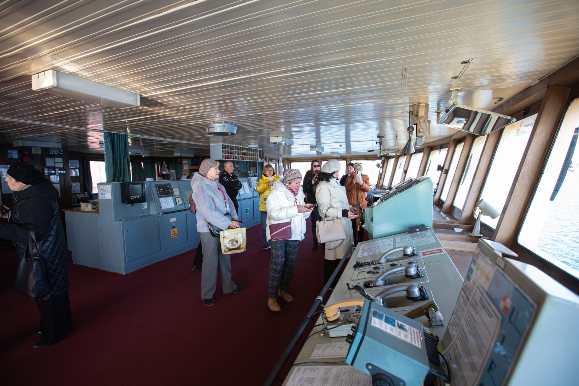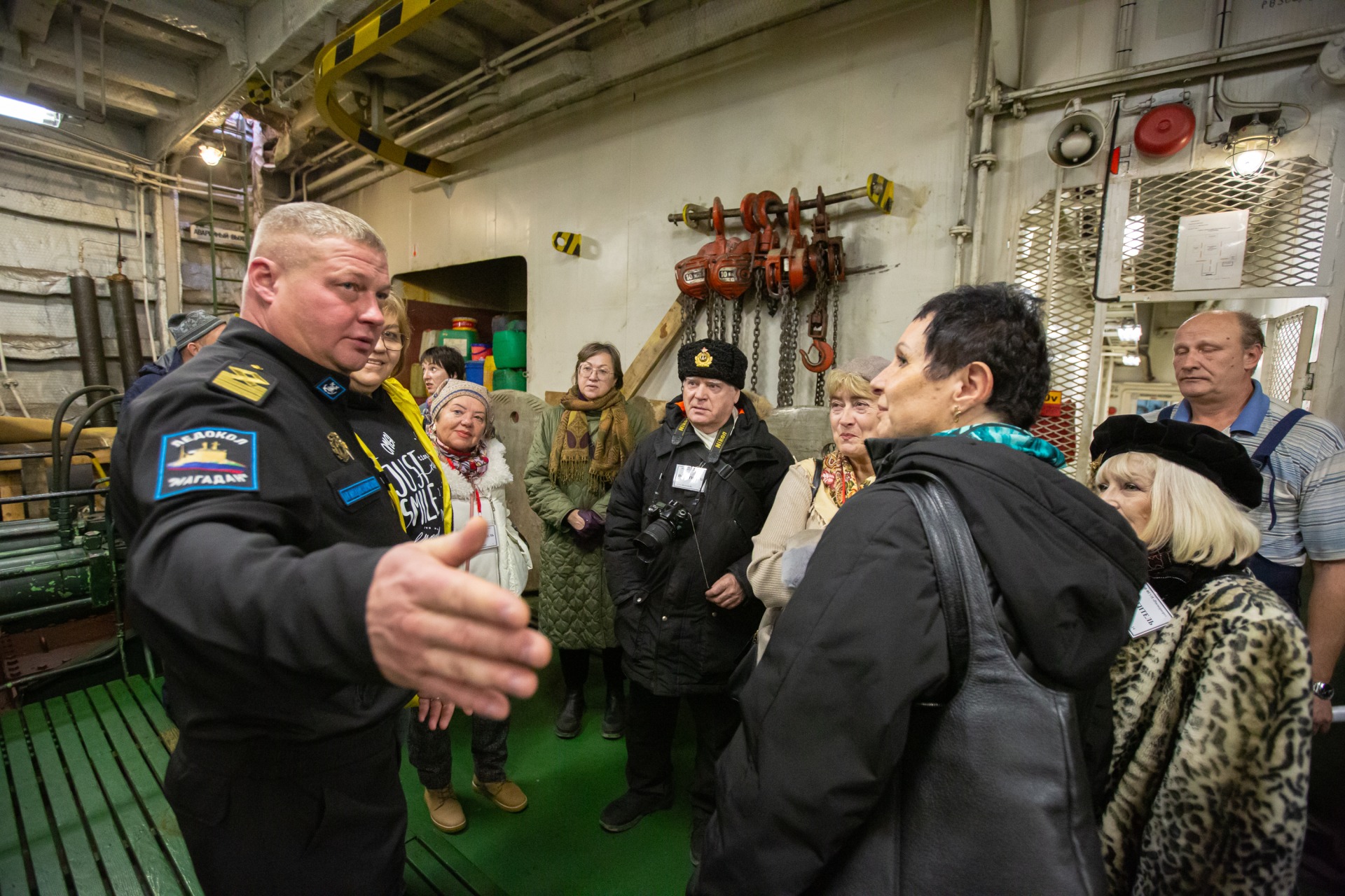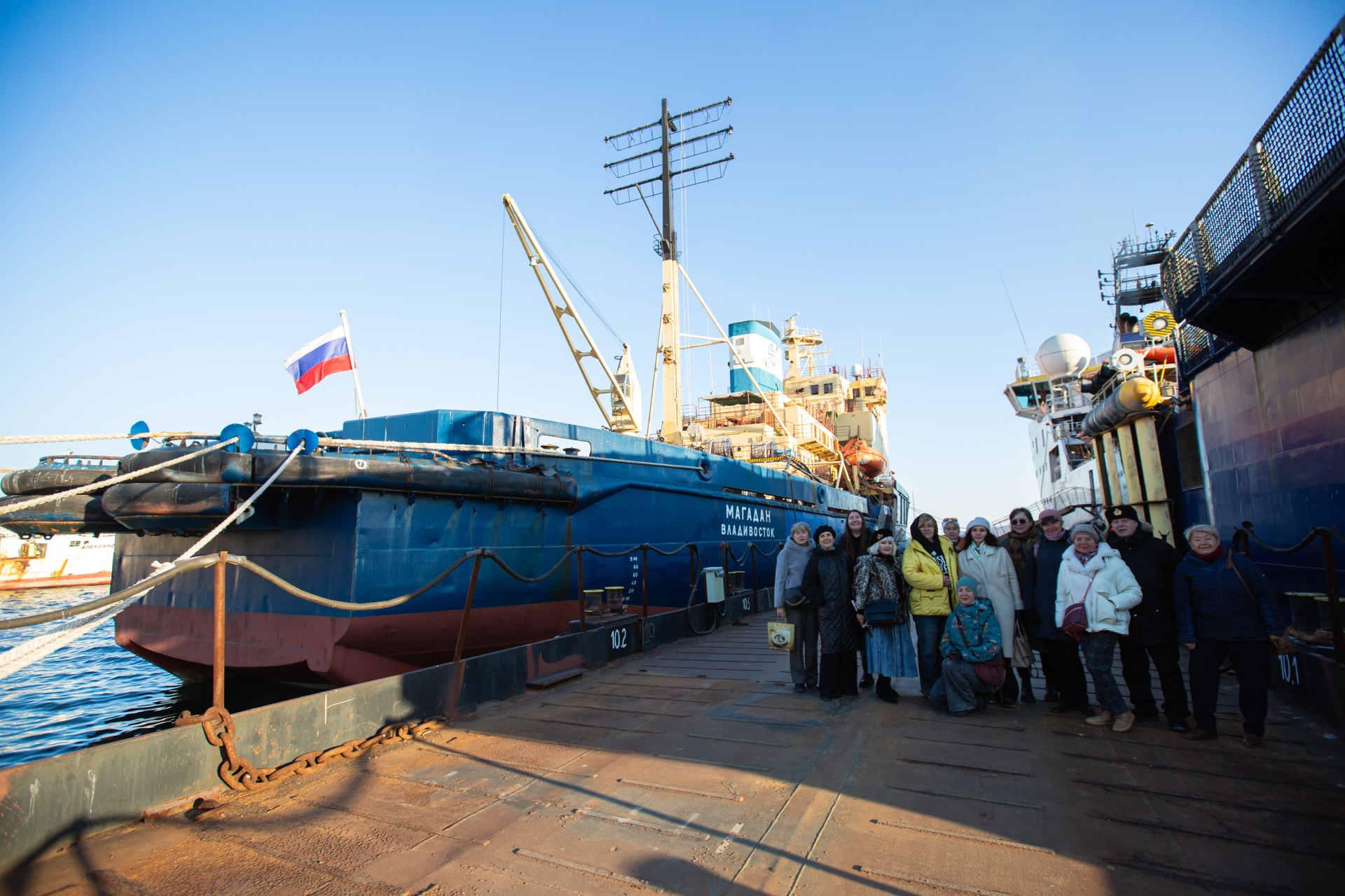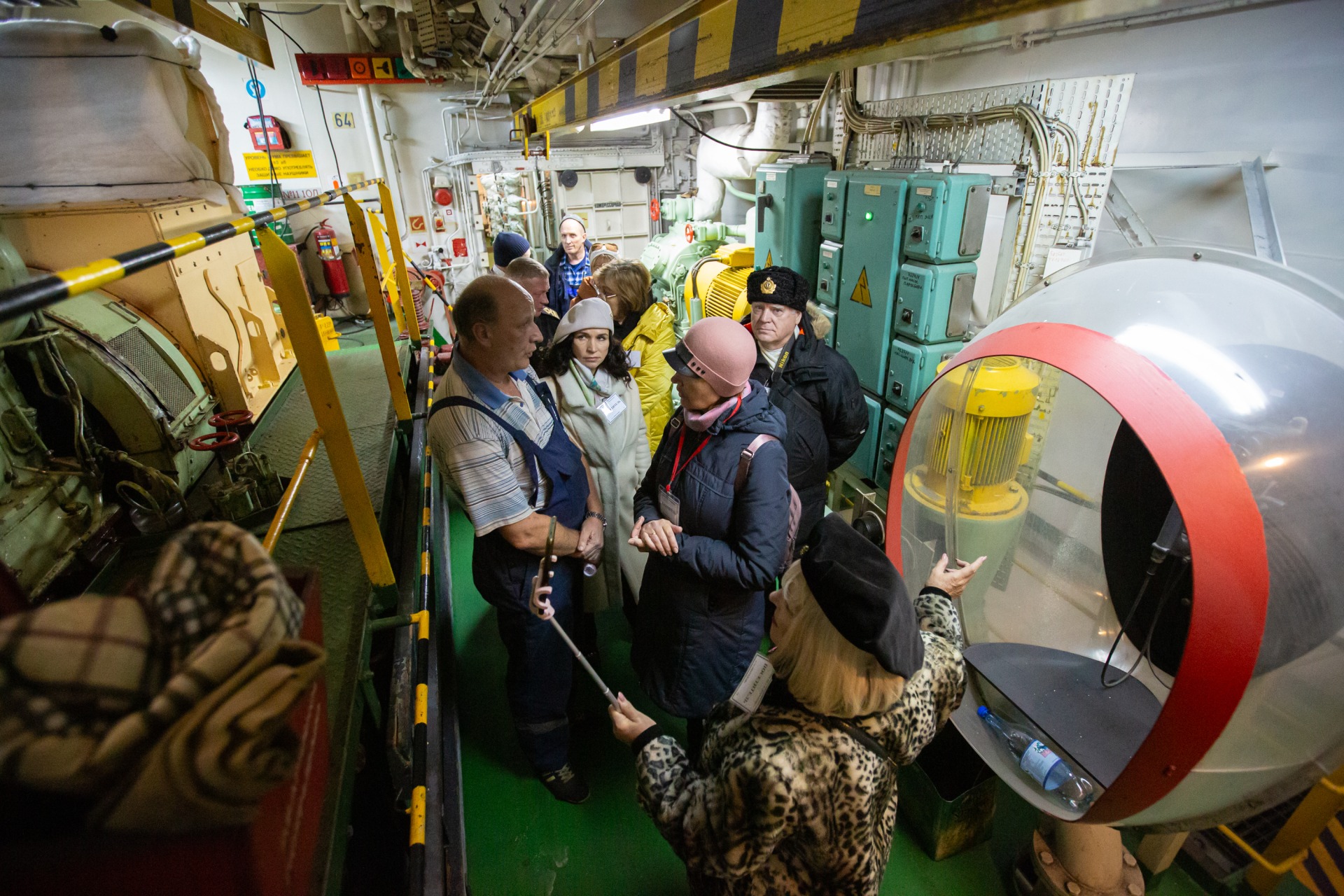 Капитан ледокола «Магадан» Рамис Закиров встречал экскурсантов вместе со старшим помощником Игорем Валерьевичем и четвертым – Игорем Ильичём. После краткого инструктажа по технике безопасности (неукоснительное "правило трех опор!), гостей пригласили в кают-компанию, где их уже ждал старший механик (по-флотски «дед»), готовый раскрыть все тайны машинного отделения. Боцман демонстрировал действие «ласточки» – стального троса, вызволяющего на буксире суда из ледяного плена. Экскурсанты узнали, что нос корабля зовется баком, корма – ютом, а судовой колокол, рында, носит гордое, почти военное имя – рындабуль. И ещё одно открытие ждало экскурсантов: привычный язык на колоколе превратился в баштовый конец. Ну конечно же все за него подёргали. Радушие моряков искрилось как северное сияние!