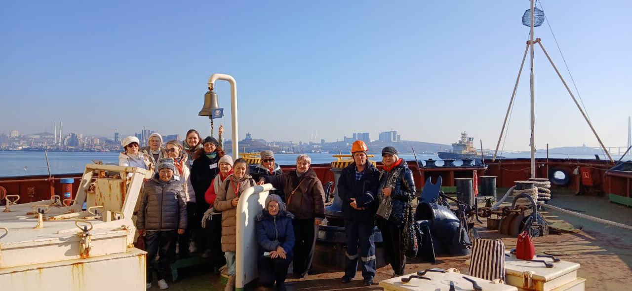 Ранее в рамках программы «500 лет освоения Северного морского пути» участники секции посетили Ледовую лабораторию ДВФУ и прочувствовали азарт ледовых баталий в кёрлинг-центре «Дом со льдом». В июле приняли участие в научно-практической конференции «Российская Арктика: 500 лет истории и перспективы развития», которая проходила в МГУ им. адм. Г.И. Невельского, посетили выставку «Великий Северный поход. Арктика, как искусство». Кульминацией стало посещение судостроительного гиганта «Звезда» в Большом Камне, где рождается современный атомный ледокол «Россия». Завершающим аккордом арктической программы стала встреча с членами экипажа на борту ледокола «Магадан». Судно было построено в 1982 году на верфях Финляндии, став вторым из серии трех субарктических ледоколов того периода, способных преодолевать ледяной покров толщиной 80-100 см.