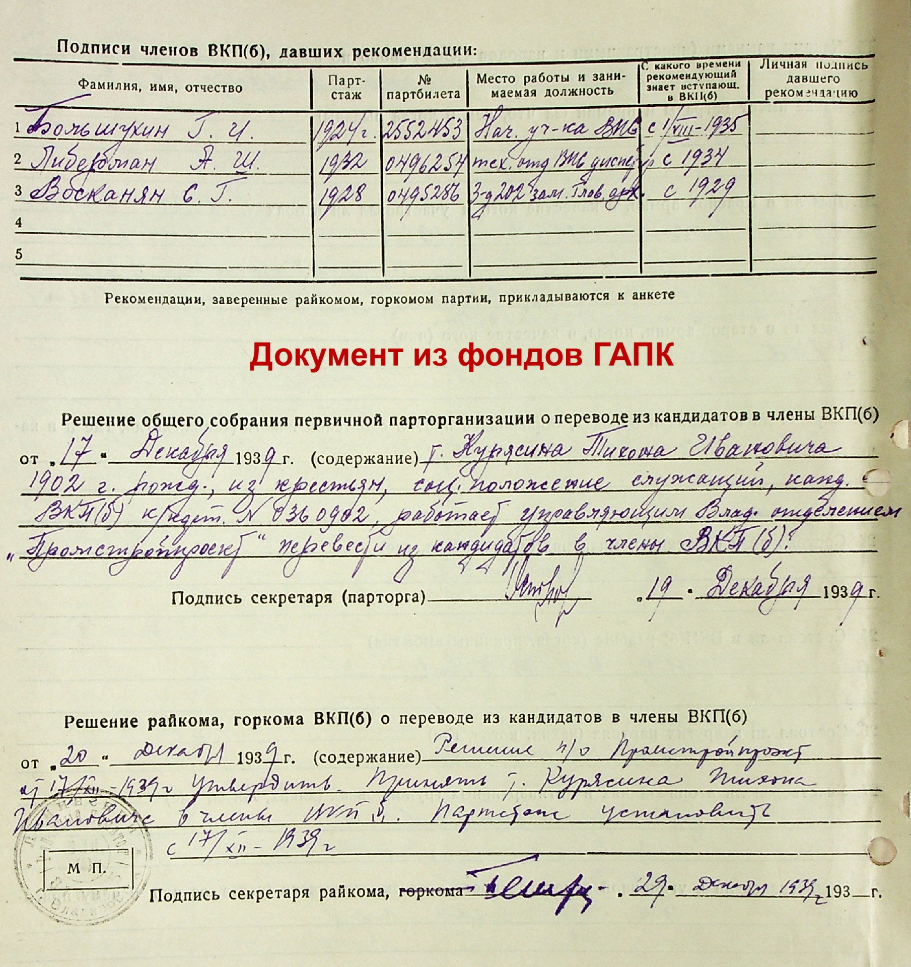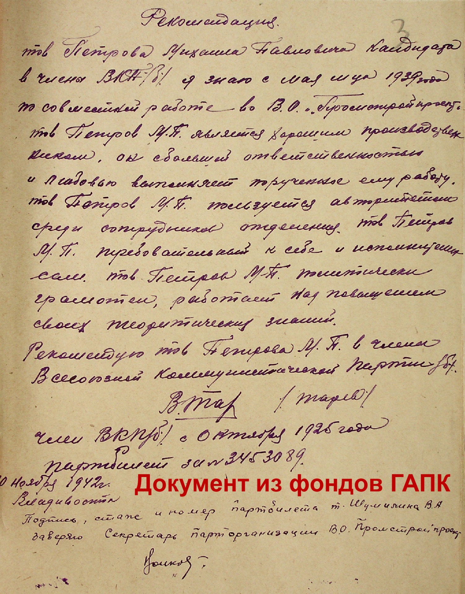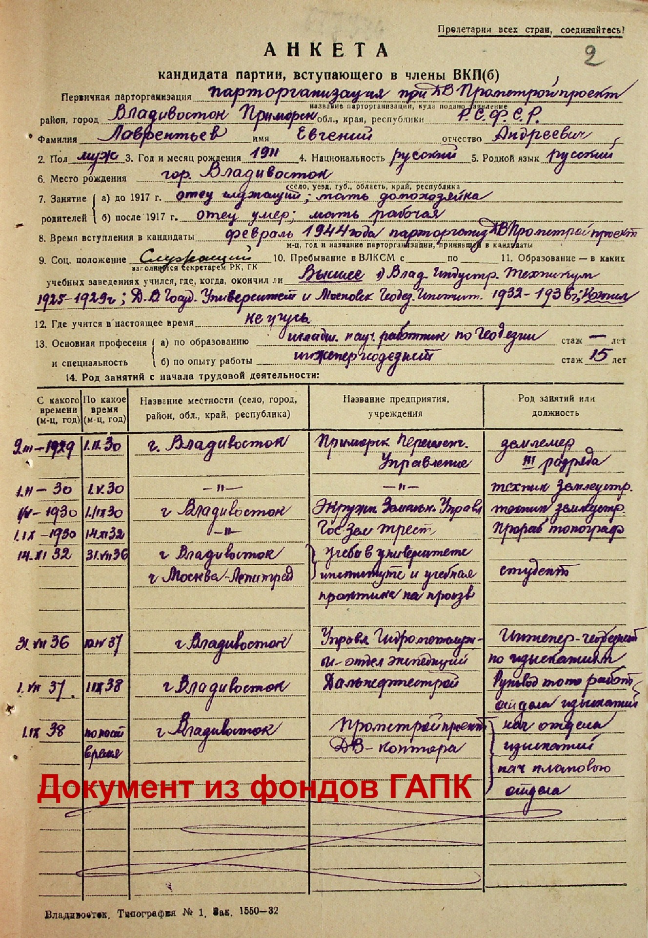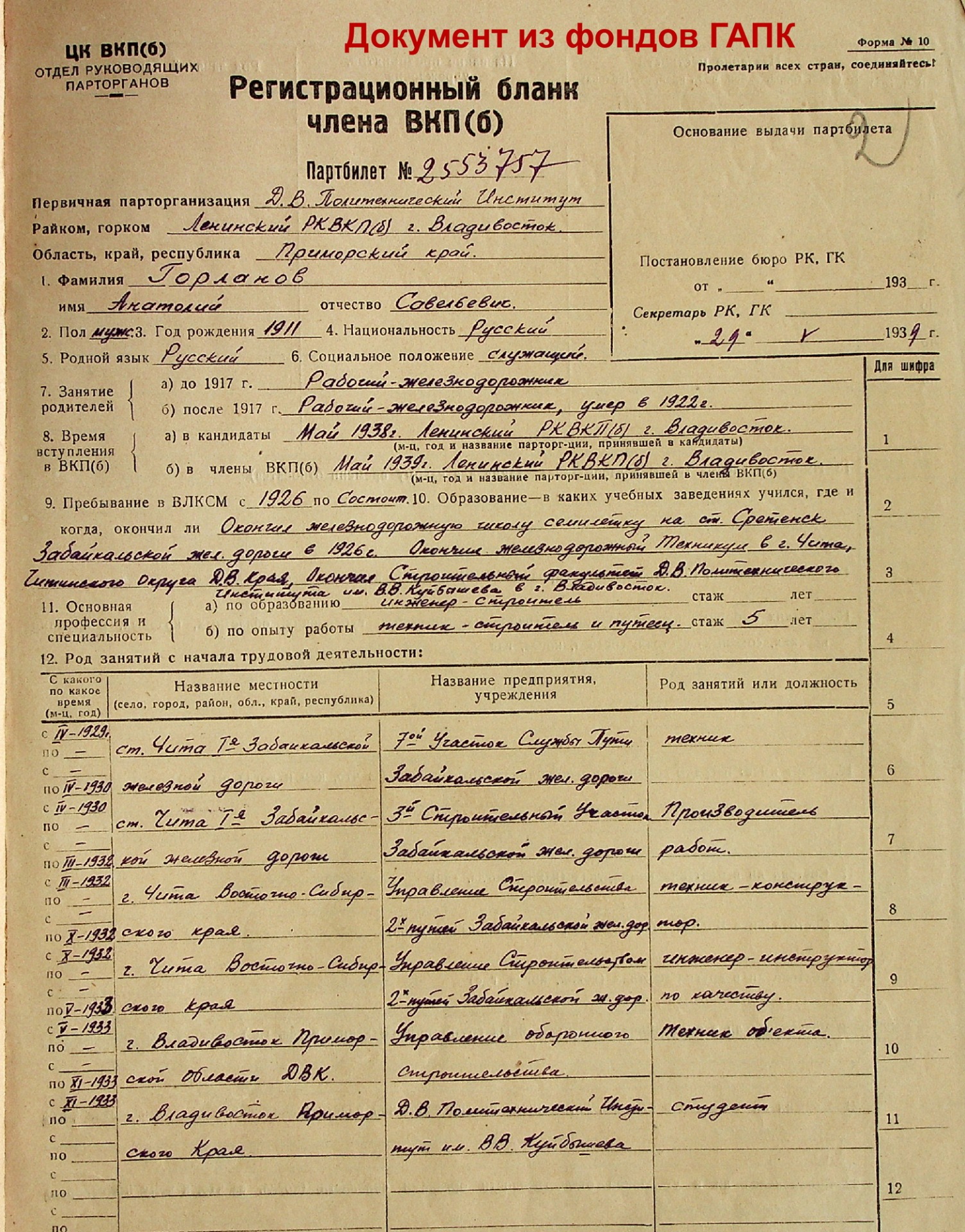 Биографические данные удалось выяснить хитрым путем: предположив, что значимые в оборонном строительстве личности непременно должны были вступить в Партию (в ВКП(б), разумеется), автор сих строк запросил сканирование кандидатских анкет из бывшего Партархива г. Владивостока. К сожалению, анкетные данные будущих коммунистов хранятся без фотокарточек, а также заполняются сухим формальным языком, но даже эта скудная информация имеет большую ценность для исторического краеведения. Некоторые образцы изучаемых документов будут представлены по ходу повествования.