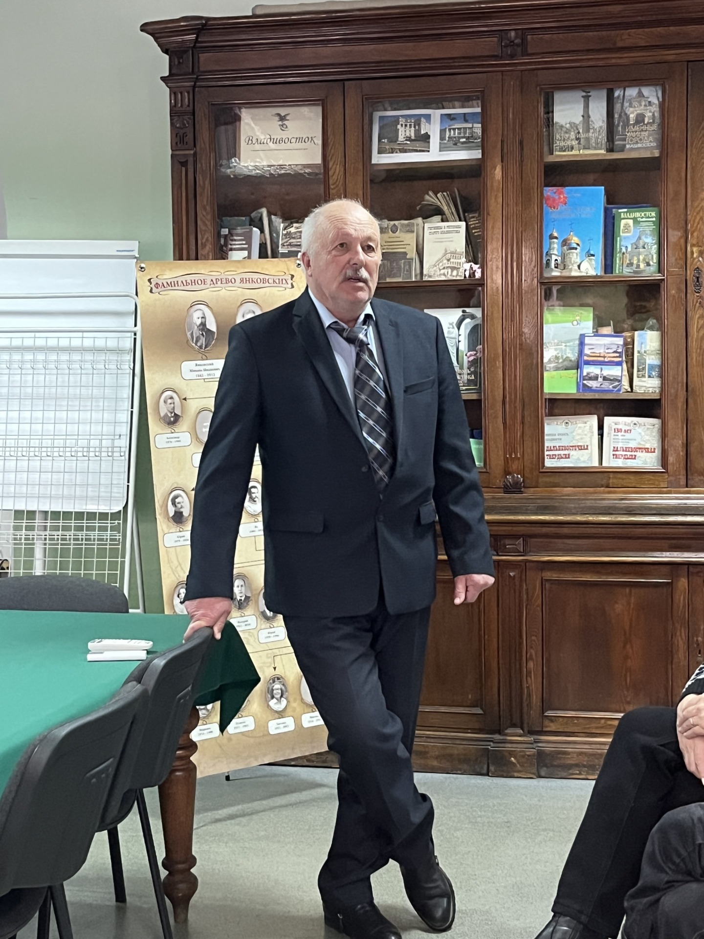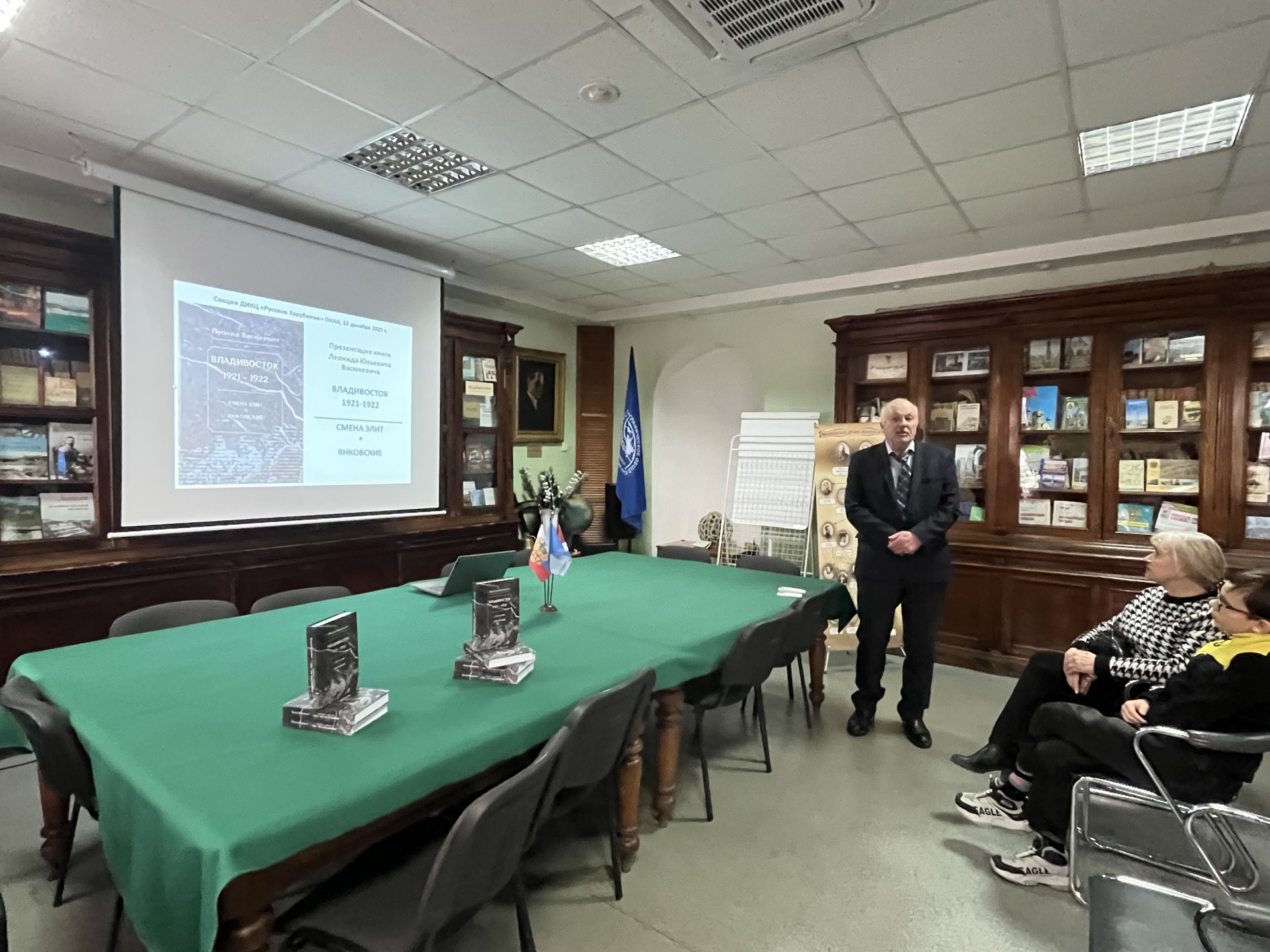 13 декабря 2025 в конференц-зале Приморского краевого отделения Русского географического общества – Общества изучения Амурского края в рамках заседания Дальневосточного информационно-культурного центра «Русское зарубежье» ПКО РГО – ОИАК состоялась презентация книги члена РГО, председателя Хасанского местного отделения Общества Леонида Васюкевича «Владивосток 1921-1922. Смена элит. Янковские».