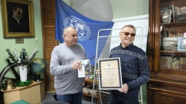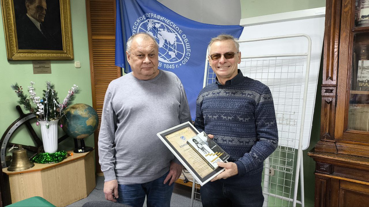 Кроме непосредственных краеведческих успехов, Алексей Буяков отметил, что буквально через пару дней Владимир Яхно будет отмечать юбилей и вручил ему Благодарность ПКО РГО – ОИАК за бескорыстный труд на благо Общества, сохранение исторического наследия Дальнего Востока, активное участие в исследовательской и просветительской деятельности, популяризацию краеведческих знаний и активную жизненную позицию. Дополнением к Благодарности стала книга Ивана Егорчева о секретных экспедициях В.К. Арсеньева 1911–1913 гг.