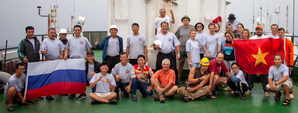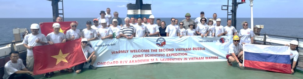 Проведенная экспедиция во многом основывается на результатах первой крупной после длительного перерыва Российско-Вьетнамской геолого-геофизической, газогеохимической и океанографической экспедиции на НИС «Академик М.А. Лаврентьев» 2019 года (88 рейс). Тогда исследования выполнялись российскими и вьетнамскими коллегами, аспирантами и студентами. В период вынужденного перерыва (пандемия помешала планам провести вторую экспедицию в 2021 году) совместный коллектив опубликовал более 30 научных совместных статей, одну монографию, апробировал полученные в 88 рейсе результаты на многочисленных международных конференциях, совместно представлял позиции по ряду вопросов на ассамблеях Межправительственной океанографической комиссии (МОК) ЮНЕСКО, ВЕСТПАК и др. Несколько молодых ученых защитили диссертации как в России, так и во Вьетнаме на основе фактического экспедиционного материала. В результате для экспедиции 2025 года была сформирована опытная сработавшаяся команда как старших, так и молодых профессионалов (19 с российской стороны и 10 с вьетнамской), что позволило добиться новых достижений. В целом коллектив ведет совместные работы начиная с 2010 года в рамках Совместной лаборатории по морским наукам и технологиям, а ныне Совместного центра ТОИ ДВО РАН – ИНЗ ВАНТ на основе соглашения между организациями. Структура экспедиции представлена несколькими комплексными отрядами: геологический, геофизический, гидрофизический, геомикробиологический, газогеохимический, в каждый входили российские и вьетнамские специалисты.