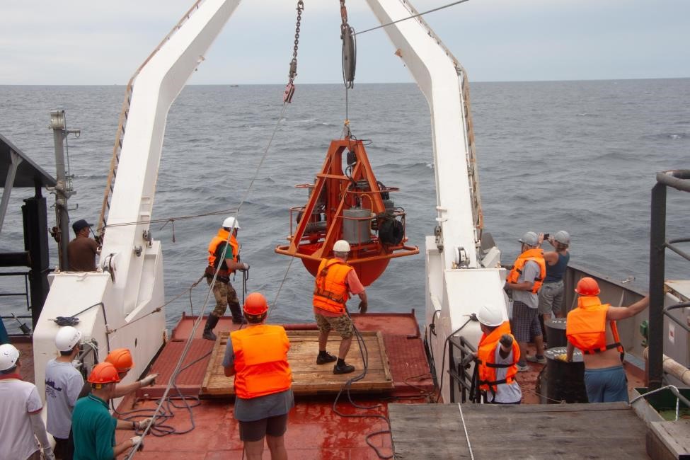 Спуск геологического колонкового пробоотборника гравитационного типа совместным отрядом (производство ТОИ ДВО РАН)
