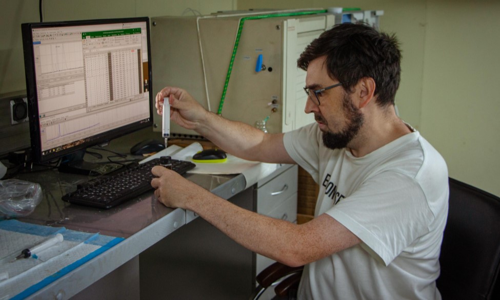 Вед. инженер Е.В. Лифанский в судовой газогеохимической лаборатории выполняет анализы на газовом хроматографе «КристаллЛюкс 4000М», производство ООО «НПФ Мета-Хром», Россия