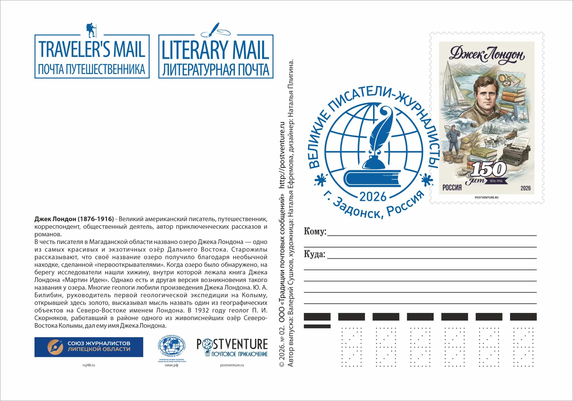 Всероссийский проект развития филатуризма «POSTVENTURE & Почтовое приключение» при поддержке Союза журналистов Липецкой области, Приморского краевого отделения Русского географического общества - Общества изучения Амурского края, ограниченным тиражом в честь 150-летия великого американского писателя Джека Лондона выпустили в свет почтовый выпуск, который представлен почтовыми конвертом, карточкой, картмаксимумом и марками-виньетками (одна марка бумажная, а другая создана из холста, имеющая персонализированную нумерацию, начиная от №1 и до №100), представленными «Литературной почтой» и «Почтой путешественника».