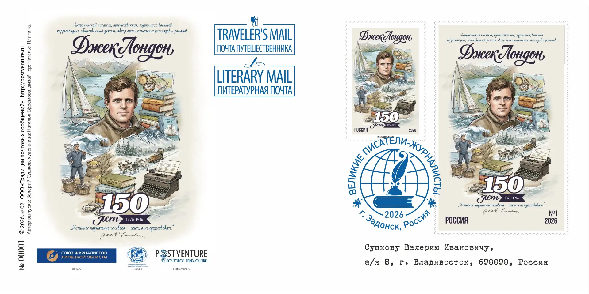 Почтовый выпуск в честь 150-летия великого американского писателя Джека Лондона, включающий в себя почтовые конверт, картмаксимум, карточку и марки-виньетки (одна марка бумажная, а другая создана из холста, имеющая персонализированную нумерацию, начиная от №1 и до №100), представленными «Литературной почтой» и «Почтой путешественника» будут отправлены в качестве почтовых сувениров в Центральный музей связи имени А.С. Попова, в научный архив русского географического общества, в Приморское краевое отделение Русского географического общества - Общества изучения Амурского края, а также в Дом-музей Джека Лондона в Калифорнию, США - Jack London State Historic Park & Museum (это исторический парк на месте поместья писателя, где можно увидеть его дом, а также небольшой музей и интерьеры дома его вдовы) и в Музей Джека Лондона в Доусон, Канаду - Jack London Museum (здесь находится копия его рабочего кабинета, фотографии, документы и другие памятные вещи, связанные с его приключениями во времена Золотой лихорадки) .