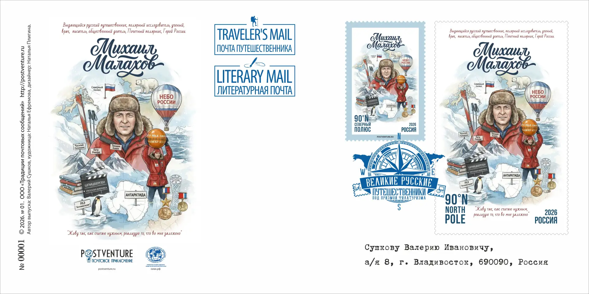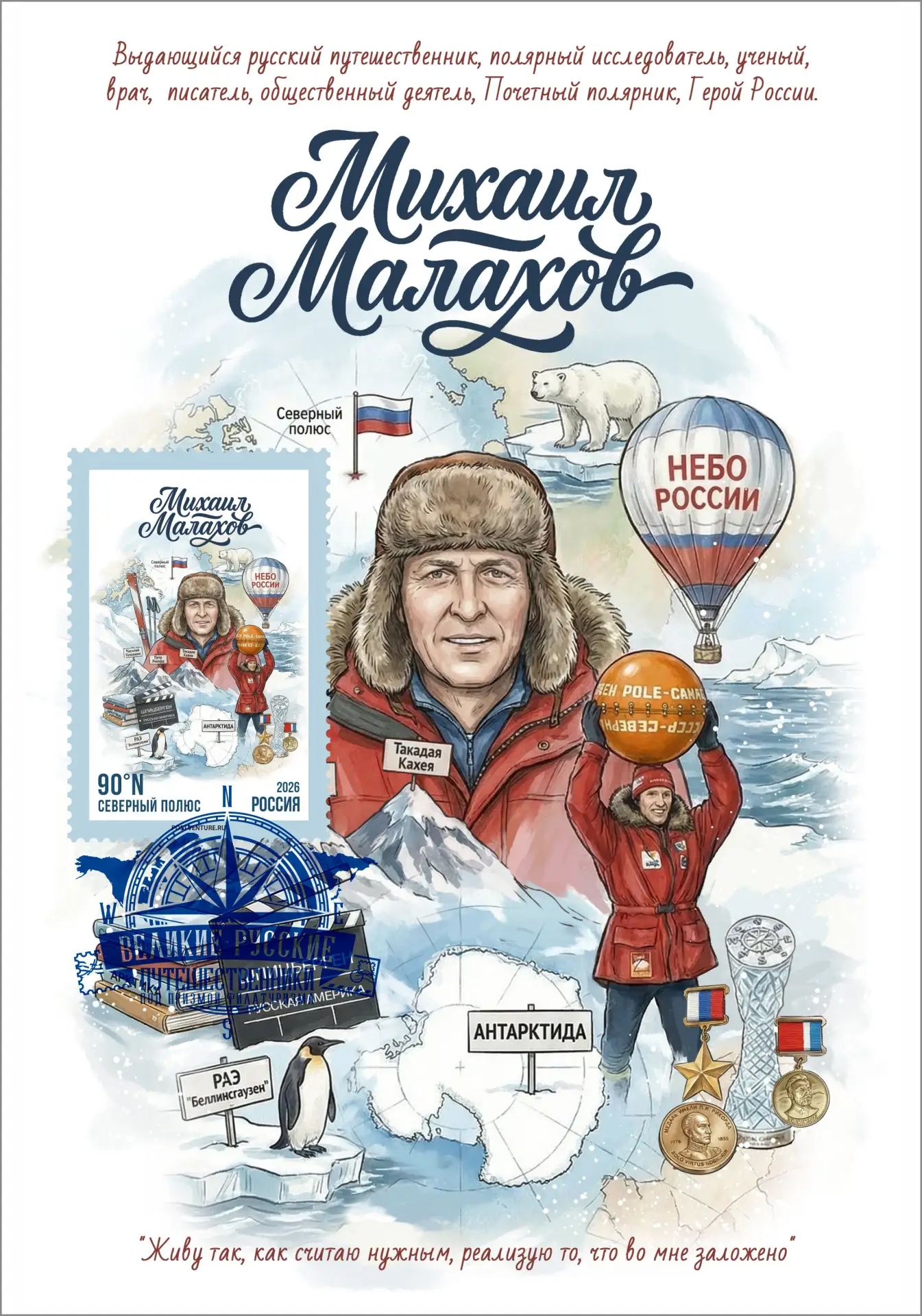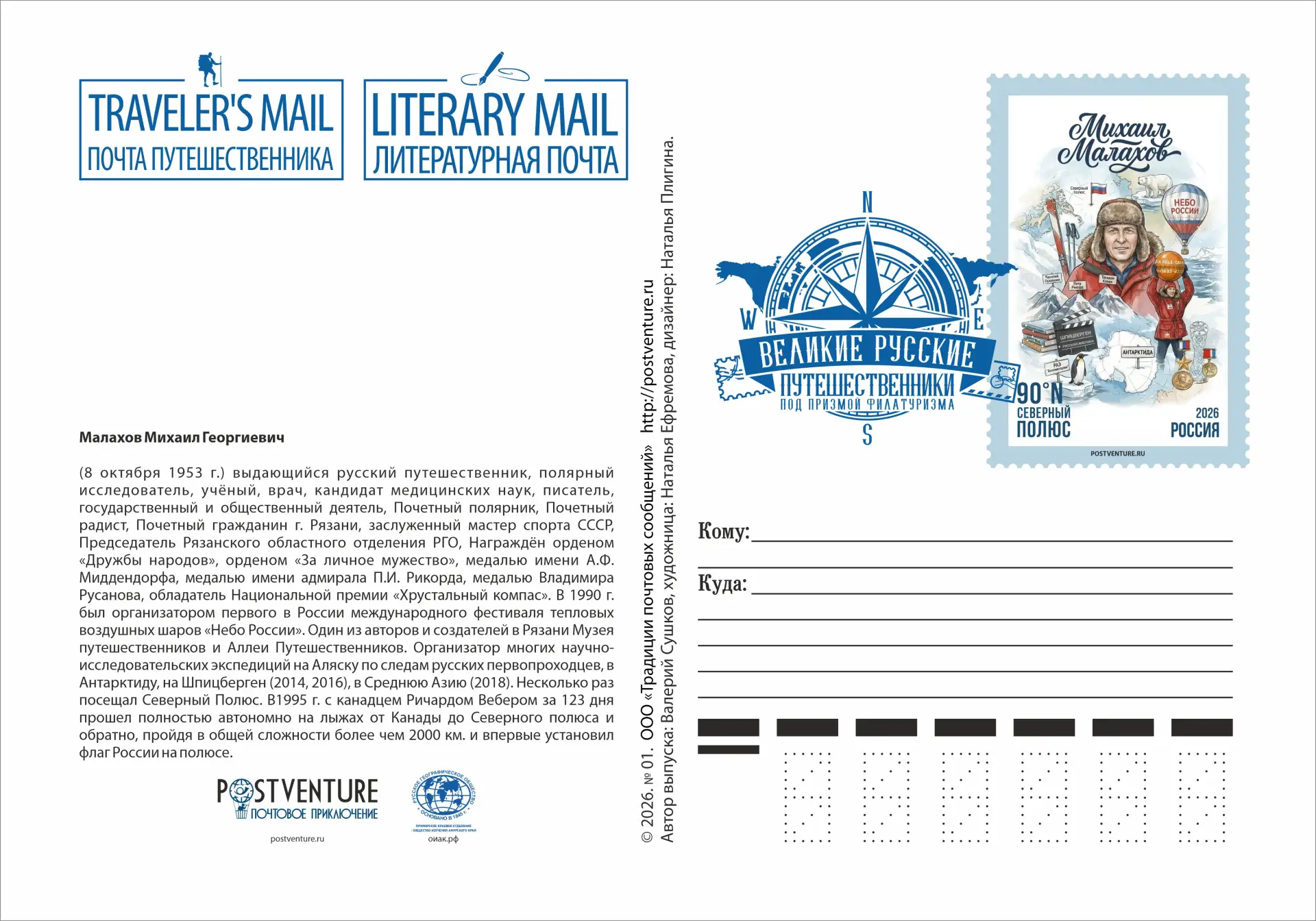Вышел в свет почтовый выпуск в серии «Почта путешественника» и «Литературная почта», посвященный выдающемуся русскому путешественнику и полярному исследователю, Герою России Михаилу Малахову