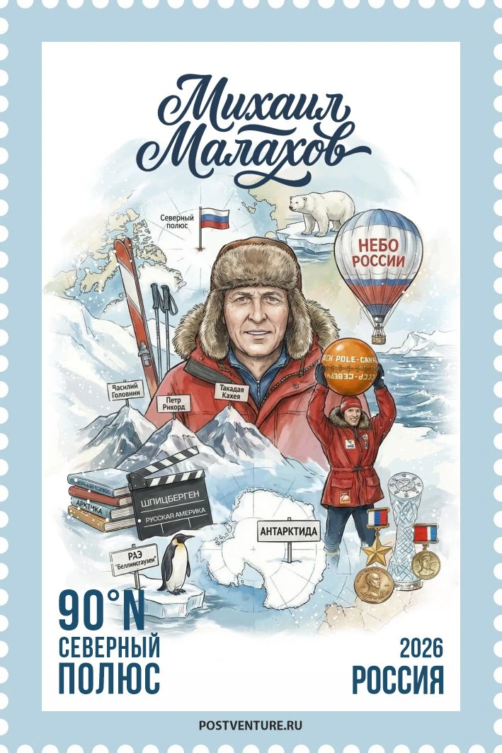 Почтовый выпуск в честь полярного исследователя и выдающегося русского путешественника, Михаила Малахова, включающий в себя почтовые конверт, карточку, картмаксимум, марки-виньетки (Одна бумажная и другая марка из холста, с необычными номиналом - 90 градусов, географической точкой Северного полюса), представленными «Почтой путешественника» и «Литературной почтой», можно заказать по контактам Всероссийского проекта развития филатуризма «POSTVENTURE & Почтовое приключение»: E-mail: info@postventure.ru или по тел./WhatsApp: +7-950-805-22-11