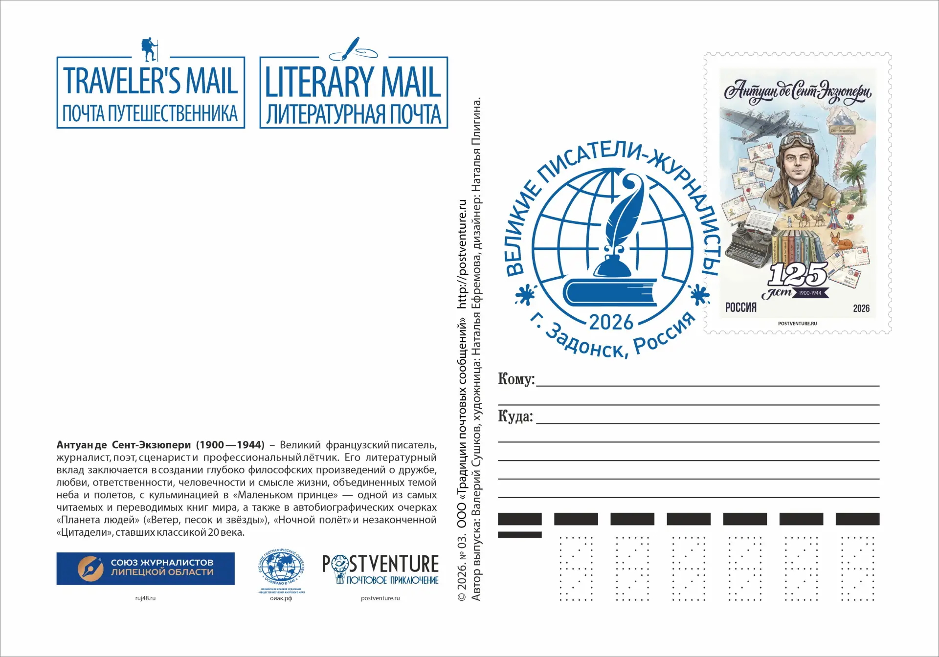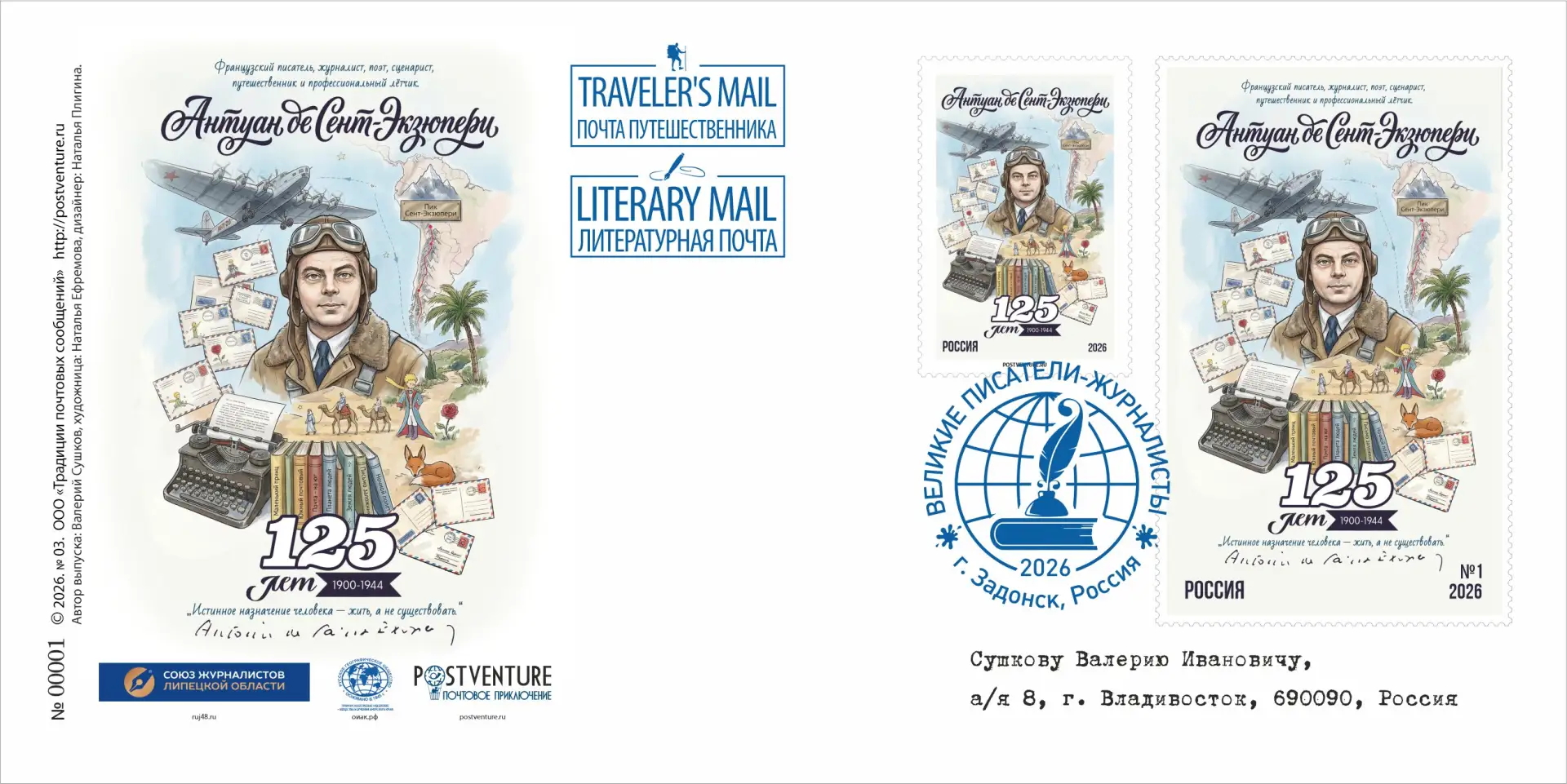 Всероссийский проект развития филатуризма «POSTVENTURE & Почтовое приключение» при поддержке Союза журналистов Липецкой области, Приморского краевого отделения Русского географического общества - Общества изучения Амурского края, ограниченным тиражом выпустили в свет почтовый выпуск, посвященный великому французскому писателю Антуану де Сент-Экзюпери, который представлен почтовыми конвертом, карточкой, картмаксимумом и уникальными марками-виньетками (одна марка бумажная, а другая создана из холста, имеющая персонализированную нумерацию, начиная от №1 и до №100), представленными «Литературной почтой» и «Почтой путешественника».
