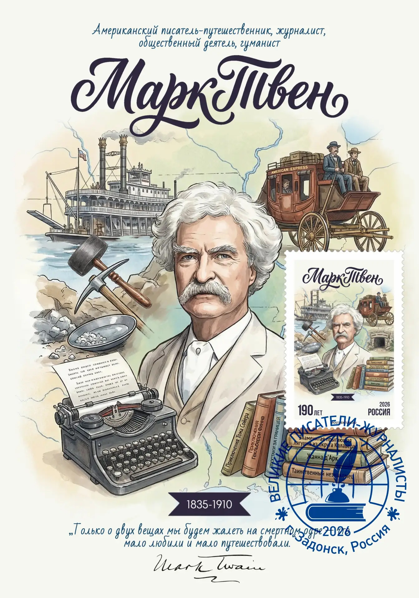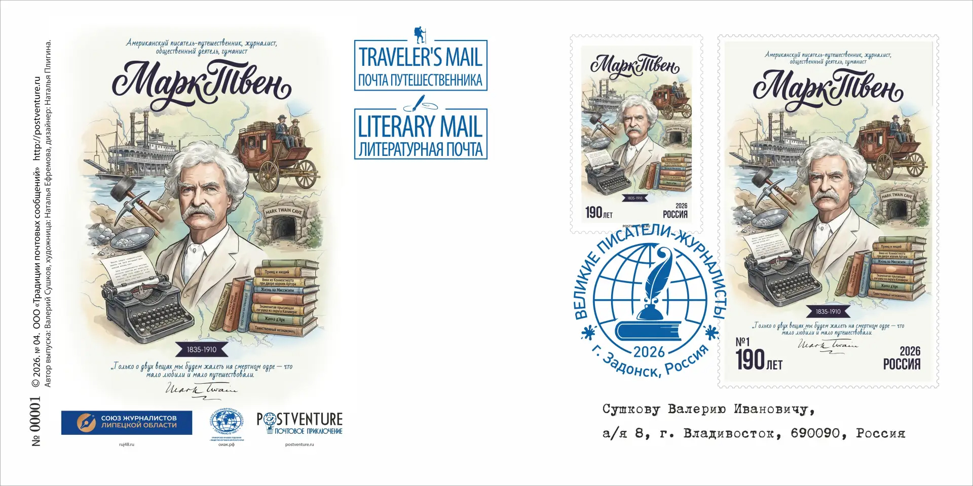 Почтовый выпуск в честь великого американского писателя Марка Твена, включающий в себя почтовые конверт, картмаксимум, карточку и марки-виньетки (одна марка бумажная, а другая создана из холста, имеющая необычный номинал - 190 лет писателя и персонализированную нумерацию, начиная от №1 и до №100), представленными «Литературной почтой» и «Почтой путешественника» будут отправлены в качестве почтовых сувениров в Центральный музей связи имени А.С. Попова, в научный архив русского географического общества, в Приморское краевое отделение Русского географического общества - Общества изучения Амурского края, а также в Дом-музей Марка Твена в Хартфорде, США - The Mark Twain House & Museum (Его знаменитый особняк, где он жил с 1874-1891 гг., теперь является музеем, полным артефактов и мебели), в Дом детства Марка Твена и Музей в Ганнибале, Миссури, США - Mark Twain Boyhood Home & Museum (здесь посетители могут увидеть дом, в котором он провел свои детские годы, а также прилегающий музей с экспонатами) и в Музей Марка Твена в Вирджинию-Сити, Невада, США (в этом историческом городке тоже есть музей, посвященный его жизни и работе в Неваде), а также в особо охраняемый объект памятника природы - пещеру Марка Твена (Mark Twain Cave) в Ганнибале, штате Миссури, США.