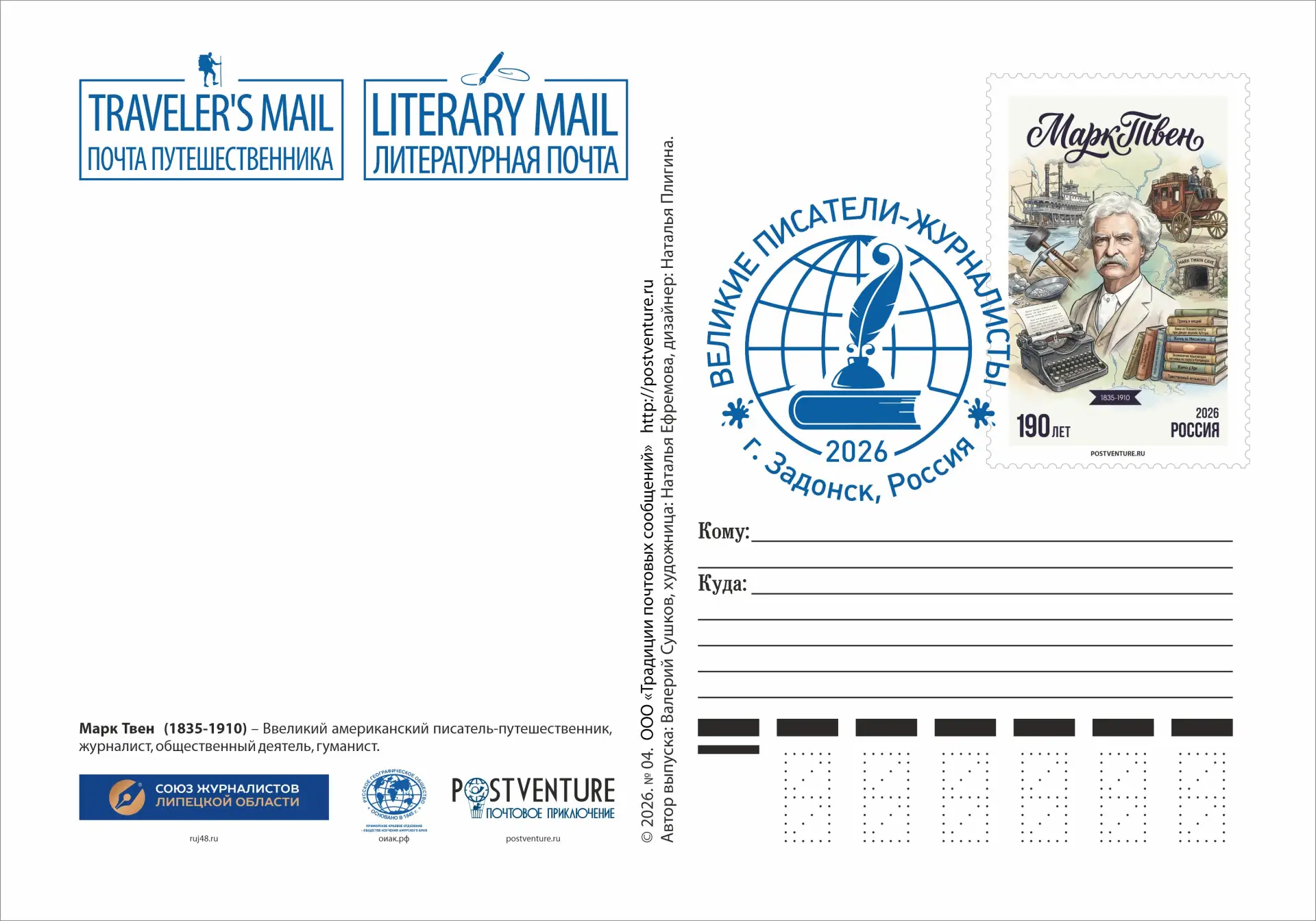 Всероссийский проект развития филатуризма «POSTVENTURE & Почтовое приключение» при поддержке Союза журналистов Липецкой области, Приморского краевого отделения Русского географического общества - Общества изучения Амурского края, ограниченным тиражом в честь великого американского писателя Марка Твена выпустили в свет почтовый выпуск, который представлен почтовыми конвертом, карточкой, картмаксимумом и марками-виньетками (одна марка бумажная, а другая создана из холста, имеющая необычный номинал - 190 лет писателя и персонализированную нумерацию, начиная от №1 и до №100), представленными «Литературной почтой» и «Почтой путешественника».