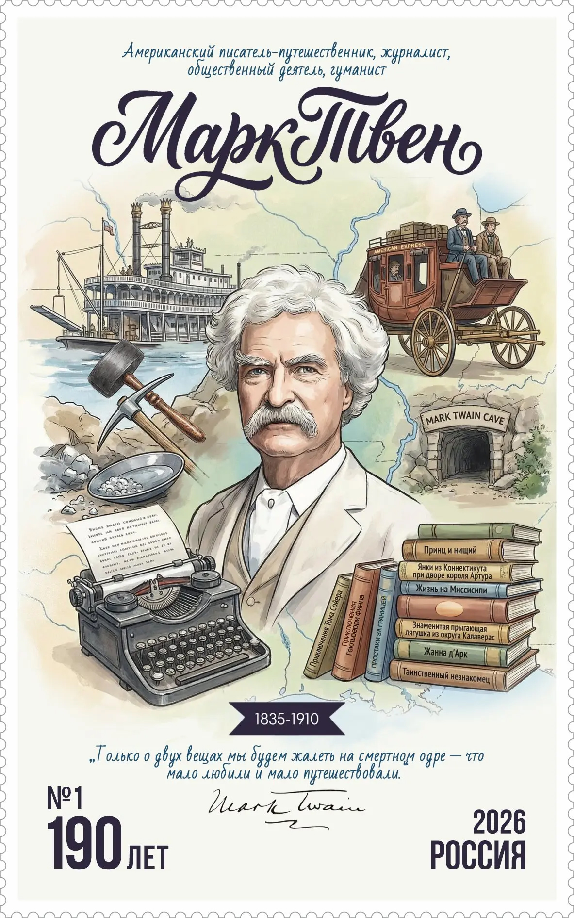 Почтовый выпуск в честь великого американского писателя Марка Твена, включающий в себя почтовые конверт, карточку, картмаксимум и марки-виньетки (одна марка бумажная, а другая создана из холста, имеющая необычный номинал - 190 лет писателя и персонализированную нумерацию, начиная от №1 и до №100), представленными «Литературной почтой» и «Почтой путешественника», можно заказать по контактам Всероссийского проекта развития филатуризма «POSTVENTURE & Почтовое приключение»: E-mail: info@postventure.ru или по тел./WhatsApp: +7-950-805-22-11.