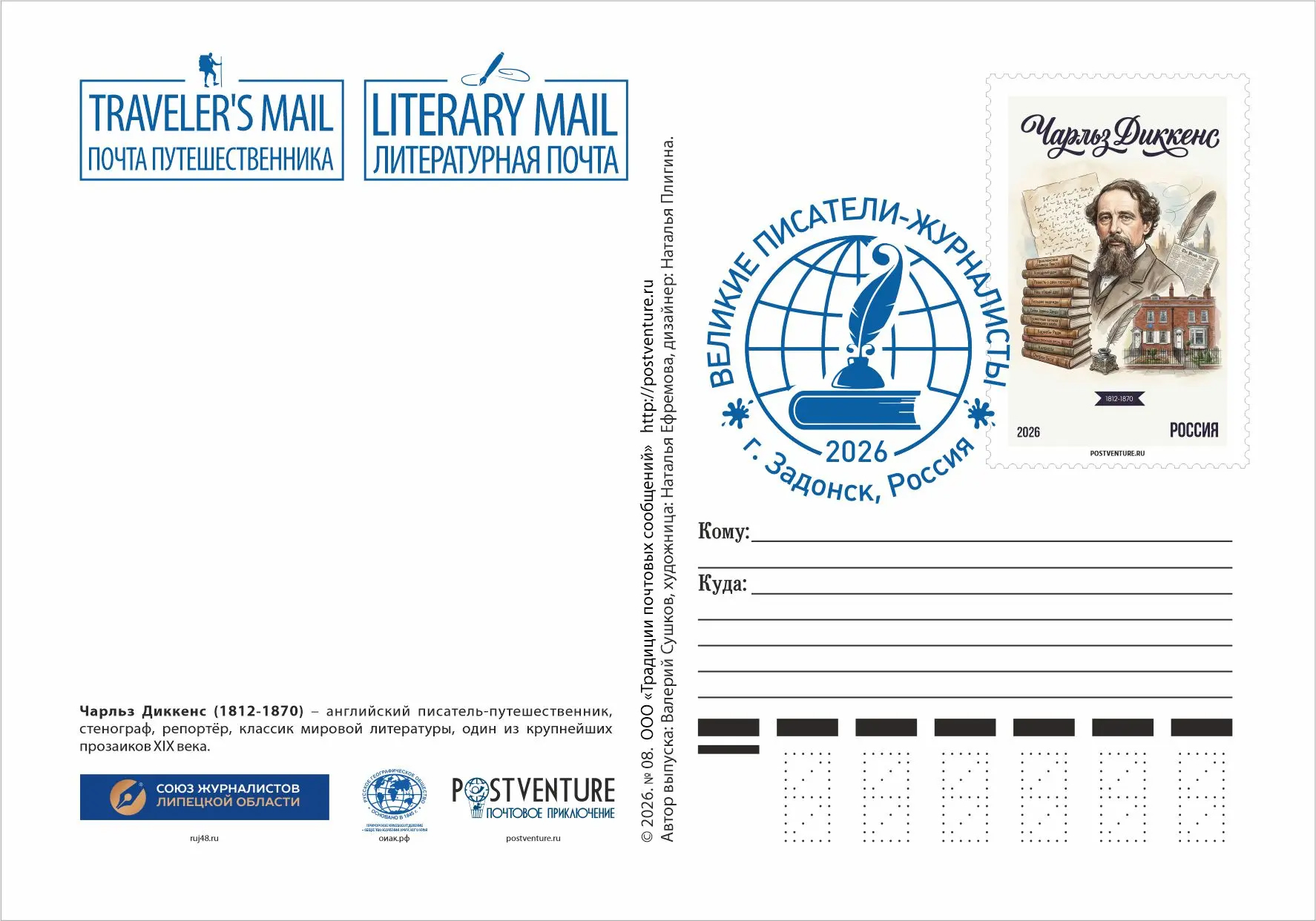 Всероссийский проект развития филатуризма «POSTVENTURE & Почтовое приключение» при поддержке Союза журналистов Липецкой области, Приморского краевого отделения Русского географического общества - Общества изучения Амурского края, ограниченным тиражом в честь великого английского писателя Чарльза Диккинса выпустили в свет почтовый выпуск, который представлен почтовыми конвертом, карточкой, картмаксимумом и марками-виньетками (одна марка бумажная, а другая создана из холста, имеющая персонализированную нумерацию, начиная от №1 и до №100), представленными «Литературной почтой» и «Почтой путешественника».