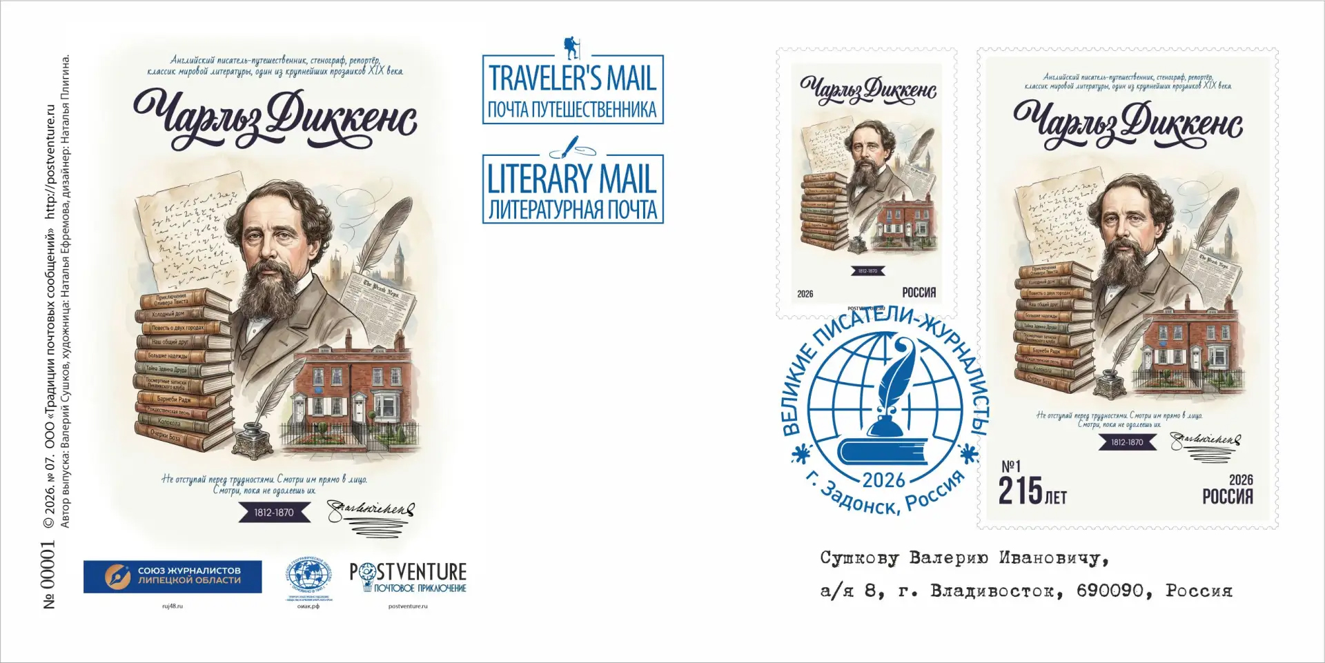 Почтовый выпуск в честь великого английского писателя Чарльза Диккинса, включающий в себя почтовые конверт, картмаксимум, карточку и марки-виньетки (одна марка бумажная, а другая создана из холста, имеющая персонализированную нумерацию, начиная от №1 и до №100), представленными «Литературной почтой» и «Почтой путешественника» будут отправлены в качестве почтовых сувениров в Центральный музей связи имени А.С. Попова, в научный архив русского географического общества в г. С-Петербург, в Приморское краевое отделение Русского географического общества - Общества изучения Амурского края в г. Владивосток, а также в Дом-музей Чарльза Диккенса в Лондон - Charles Dickens Museum (Музей включает в себя рабочий кабинет писателя, спальни, экспозиции, посвященные созданию романов «Оливер Твист» и «Посмертные записки Пиквикского клуба»).