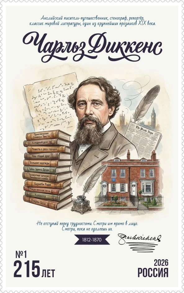 Почтовый выпуск в честь великого английского писателя Чарльза Диккинса, включающий в себя почтовые конверт, карточку, картмаксимум и марки-виньетки (одна марка бумажная, а другая создана из холста, имеющая персонализированную нумерацию, начиная от №1 и до №100), представленными «Литературной почтой» и «Почтой путешественника», можно заказать по контактам Всероссийского проекта развития филатуризма «POSTVENTURE & Почтовое приключение»: E-mail: info@postventure.ru или по тел./WhatsApp: +7-950-805-22-11.