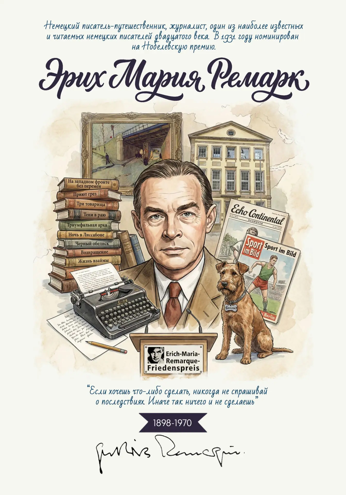 Кстати говоря, Эрих Мария Ремарк очень любил собак, и они сопровождали его всю жизнь, даря «чувство дома». Собаки были для писателя не просто питомцами, а близкими друзьями, обеспечивавшими эмоциональную поддержку. Он часто держал собак охотничьих пород, включая любимых в юности и армии псов по кличке Вульф, а позже — терьера Билли.