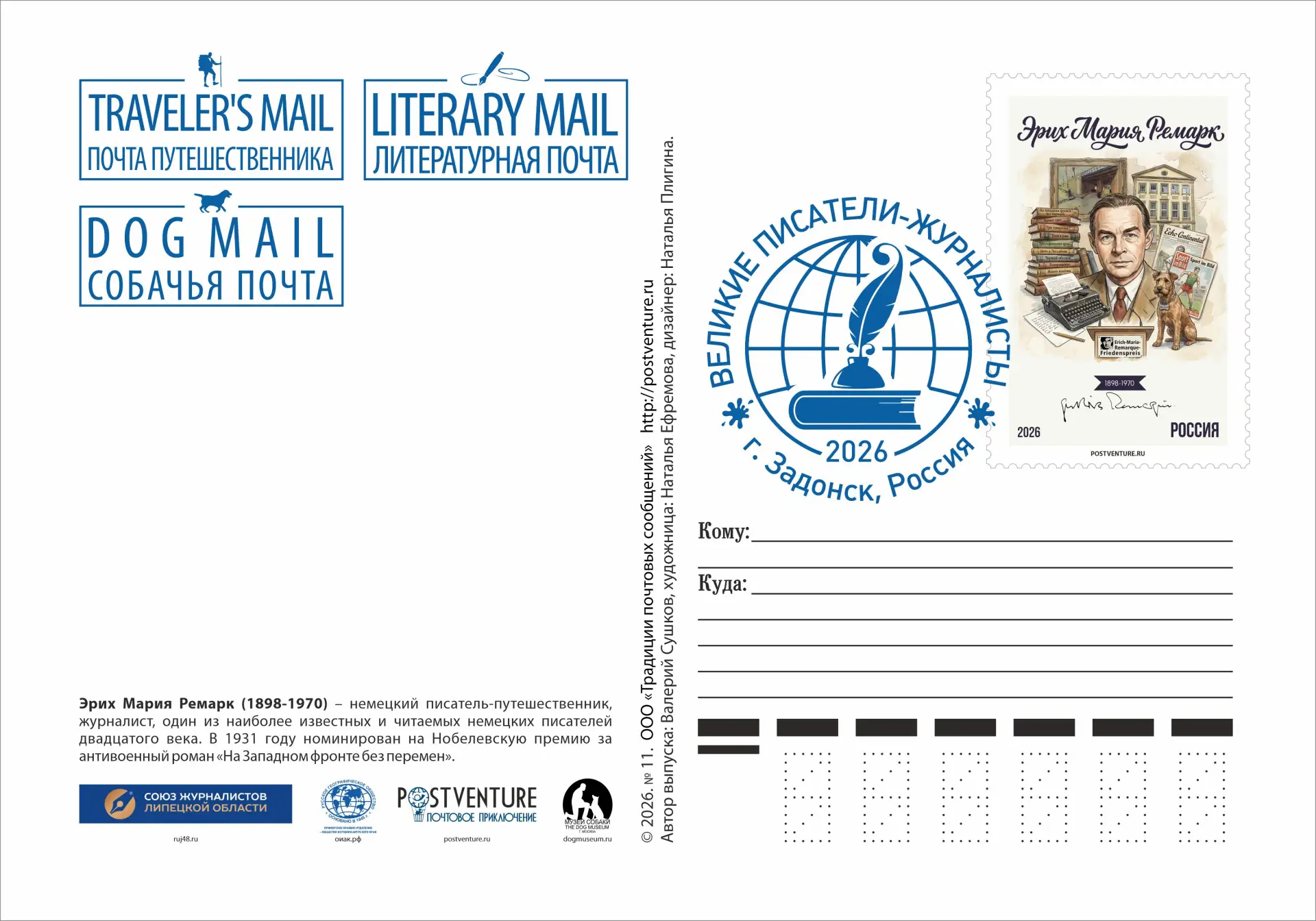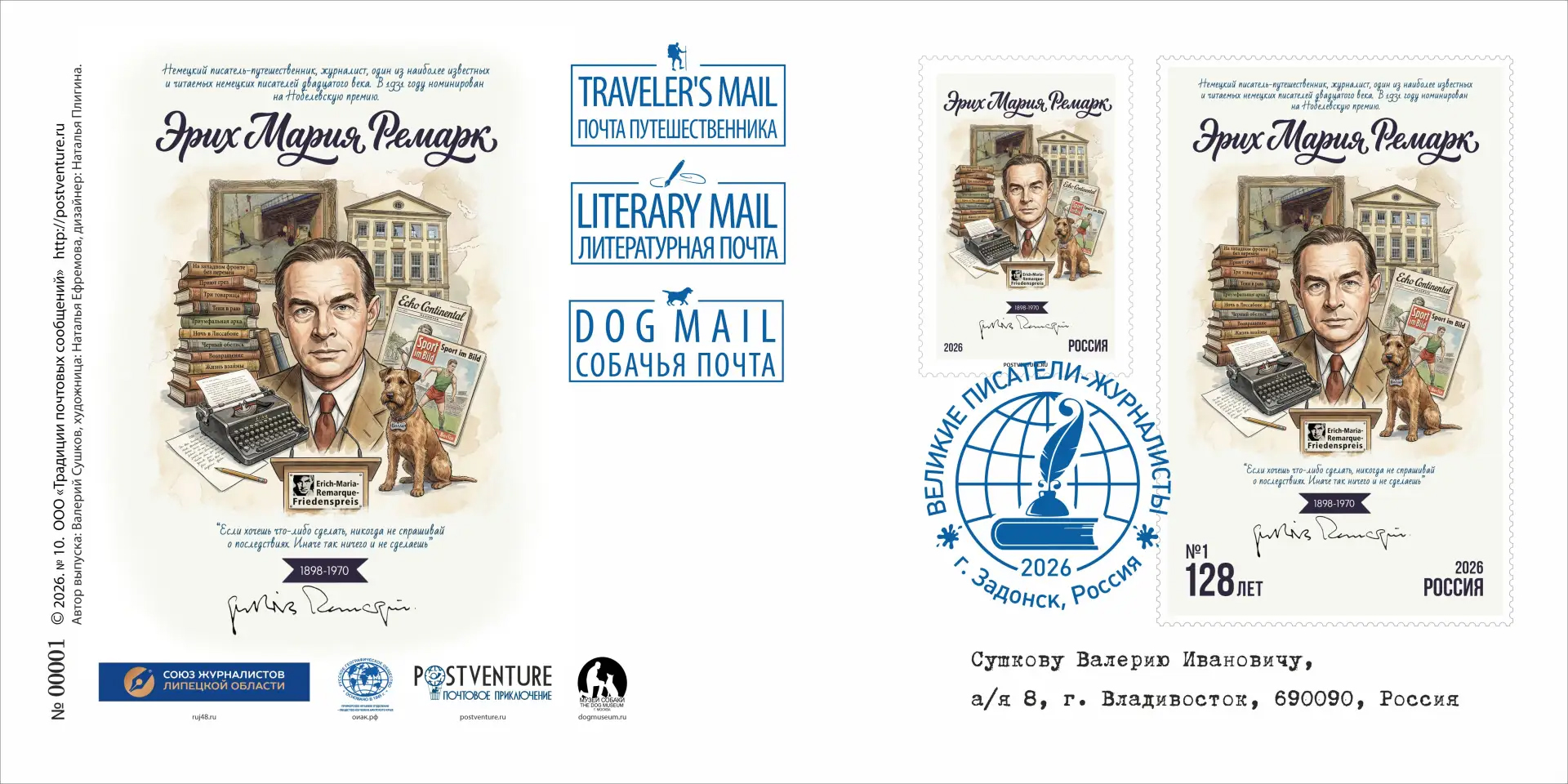 Почтовый выпуск в честь великого немецкого писателя Эриха Мария Ремарка, включающий в себя почтовые конверт, картмаксимум, карточку и марки-виньетки (одна марка бумажная, а другая создана из холста, имеющая персонализированную нумерацию, начиная от №1 и до №100), представленными «Почтой путешественника», «Литературной почтой» и «Собачьей почтой» будут отправлены в качестве почтовых сувениров в Центральный музей связи имени А.С. Попова, в научный архив русского географического общества в г. С-Петербург, в Приморское краевое отделение Русского географического общества - Общества изучения Амурского края в г. Владивосток, в Музей Собаки в г. Москву, а также в Центр-Музей Эриха Марии Ремарка (Erich Maria Remarque-Friedenszentrum) в родной город писателя — Оснабрюк в Германию. (Центр был открыт в 1996 году, который служит архивом, музеем и местом проведения выставок и премий, посвященных жизни, творчеству и идеям Ремарка).