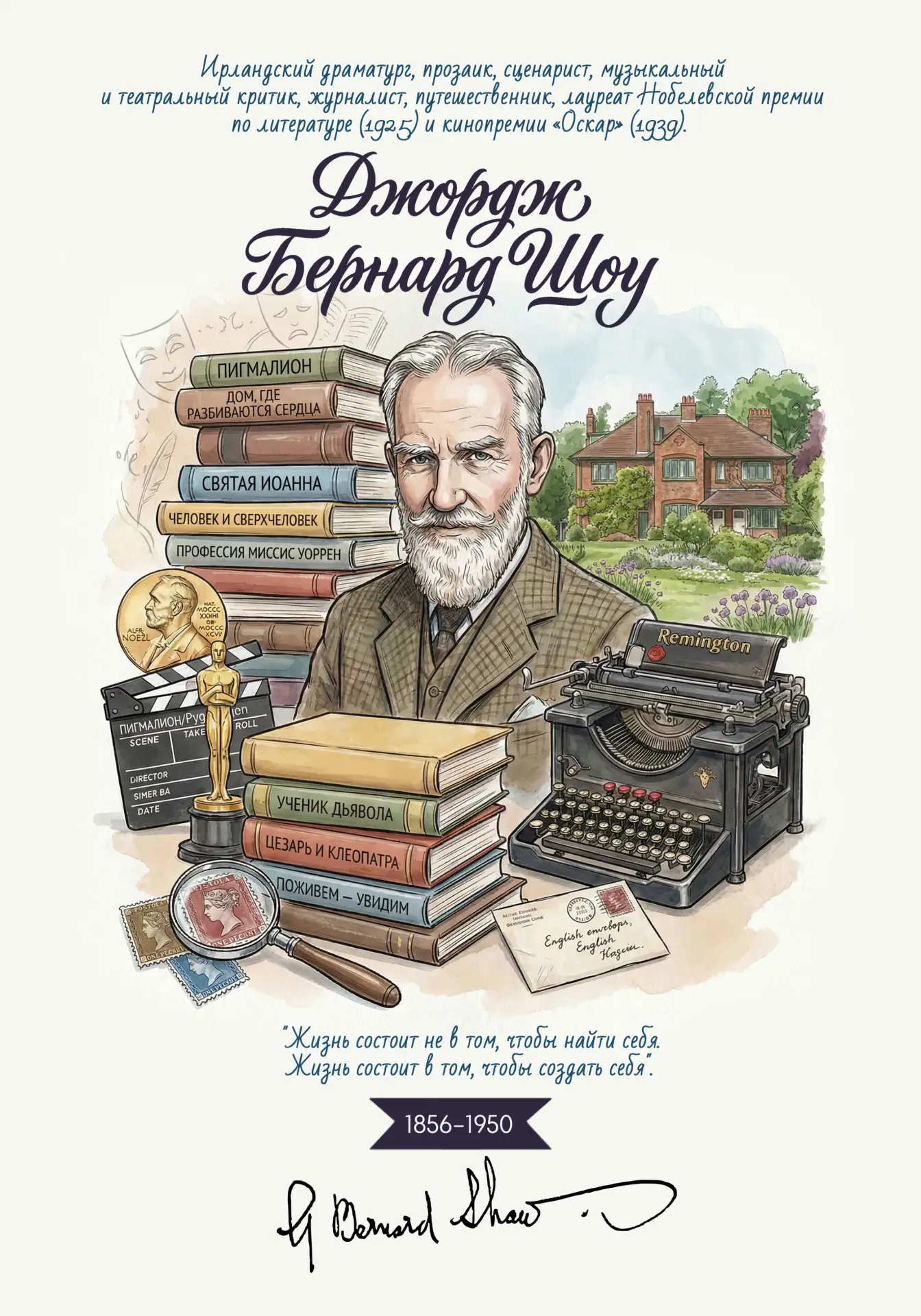 Джордж Бернард Шоу (1856–1950) - ирландский драматург и романист, журналист, путешественник, музыкальный и театральный критик, лауреат Нобелевской премии по литературе (1925) и кинопремии «Оскар» (1939) за сценарий фильма «Пигмалион», Второй (после Шекспира) по популярности драматург в английском театре. За свою долгую жизнь написал 63 пьес, а также романы, критические произведения, эссе и больше чем 250 000 писем. В первой половине 1890-х годов работал критиком в журнале «London World». коллекционировал почтовые марки на протяжении многих лет, считая это занятие прекрасным отдыхом.