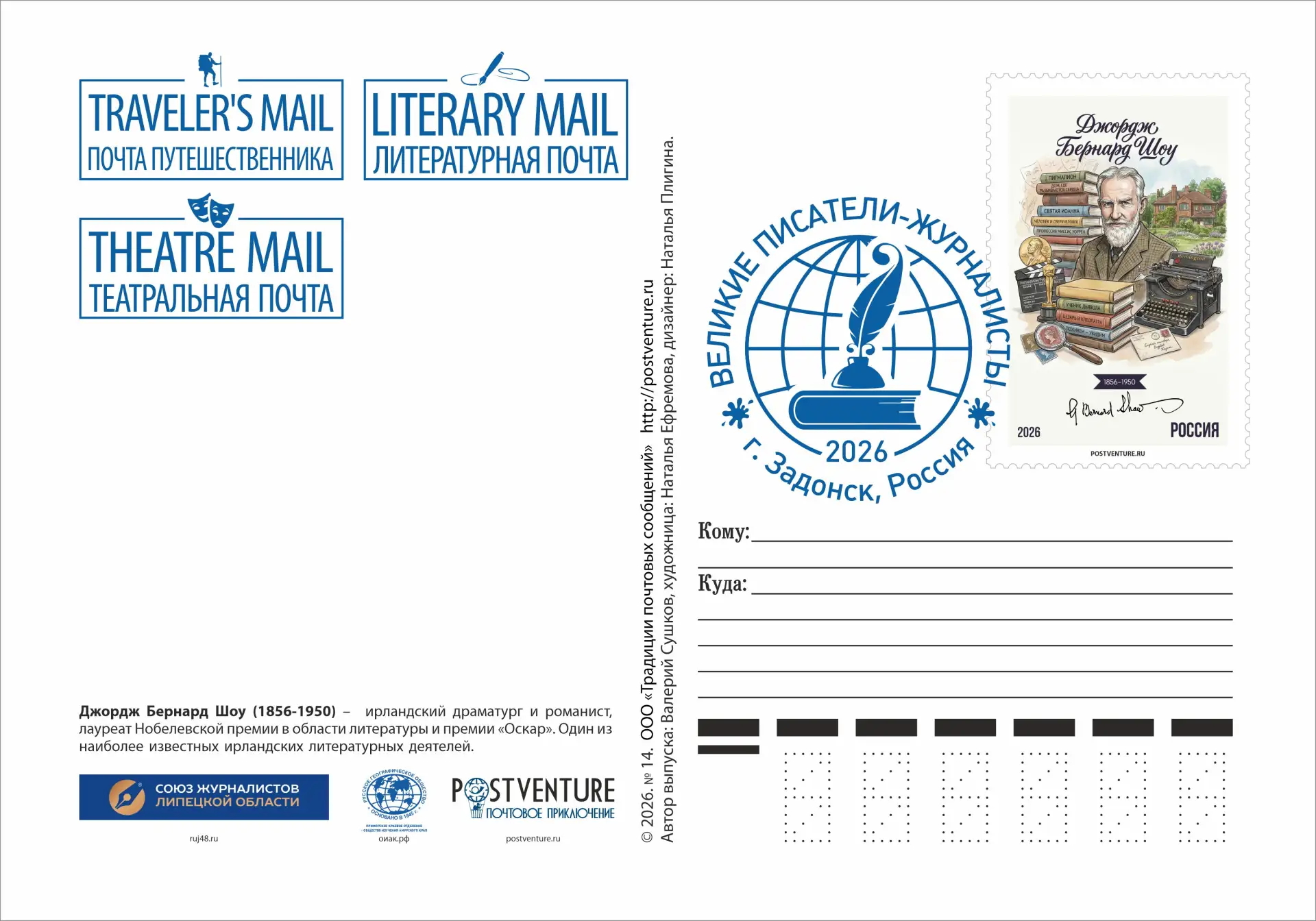 Почтовый выпуск в честь великого ирландского писателя и драматурга Джорджа Бернарда Шоу, включающий в себя почтовые конверт, картмаксимум, карточку и марки-виньетки (одна марка бумажная, а другая создана из холста, имеющая персонализированную нумерацию, начиная от №1 и до №100), представленными «Почтой путешественника», «Литературной почтой» и «Театральной почтой» будут отправлены в качестве почтовых сувениров в Центральный музей связи имени А.С. Попова, в научный архив русского географического общества в г. С-Петербург, в Приморское краевое отделение Русского географического общества - Общества изучения Амурского края в г. Владивосток, а также в Дом-Музей под названием «Уголок Шоу» (Shaw’s Corner), расположенный в деревне Эйот-Сент-Лоренс, графство Хартфордшир, Англия (в этом доме драматург прожил последние 44 года своей жизни, где писал свои произведения).