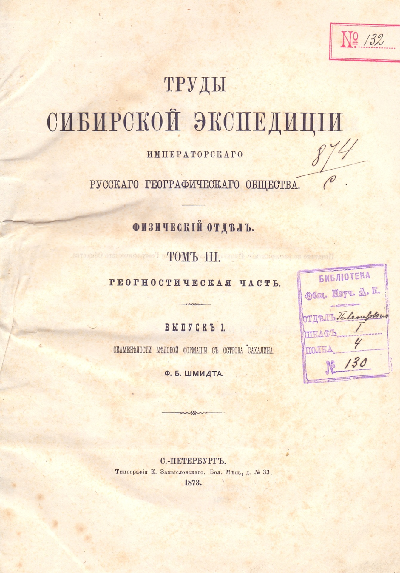 Шмидт Ф.Б., Глен П.П. Труды сибирской экспедиции Императорского русского географического общества. Физический отдел. Т. 1. Исторические отчёты. СПб., 1868. Библиотека ОИАК