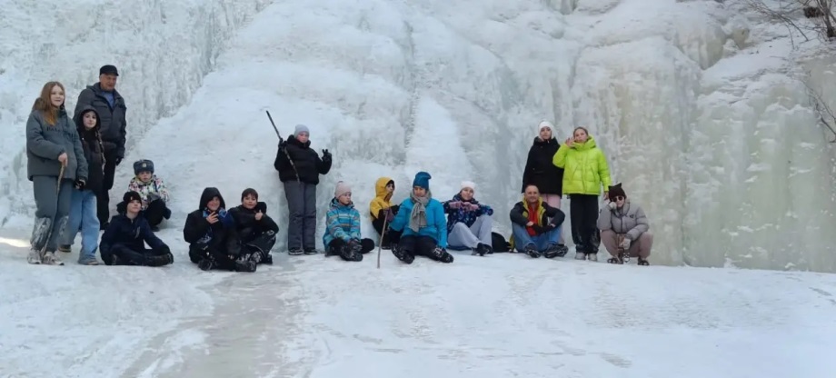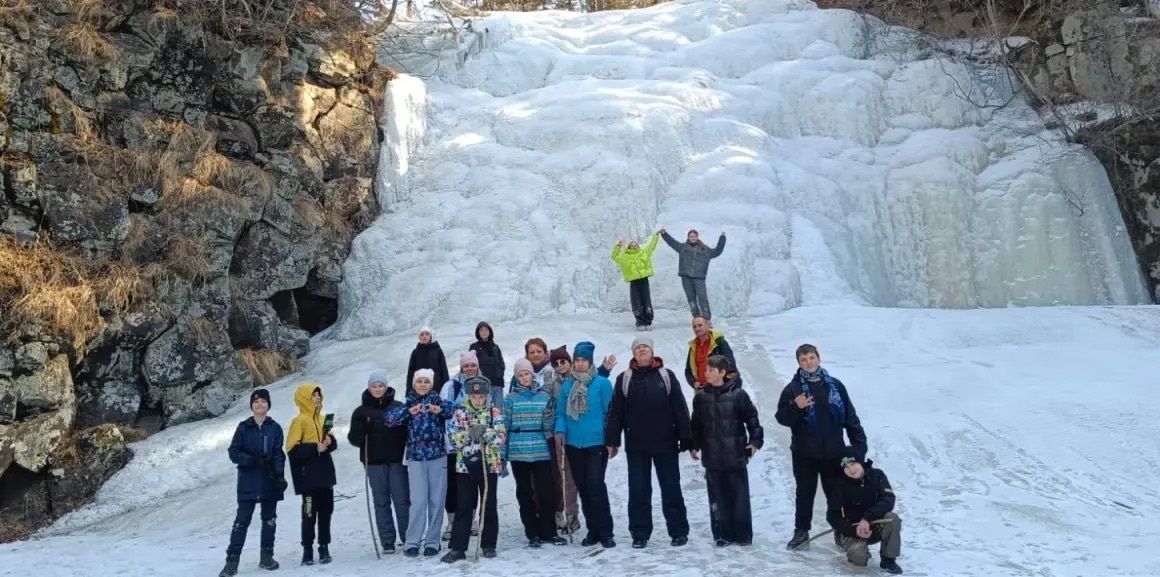 Ученики школы № 71 п. Трудовое у водопада «Неожиданный» во время прогулки по каньону «Солнечные скалы». 13 марта 2026 г.
