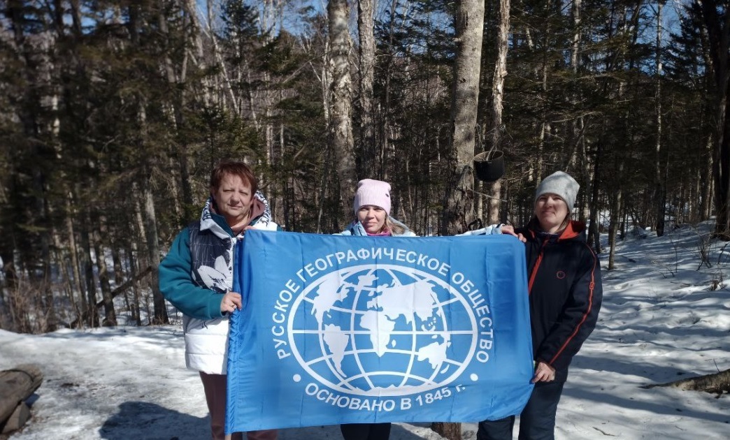 Участники пешей экскурсии по каньону «Солнечные скалы» демонстрируют флаг Русского географического общества. 13 марта 2026 г.