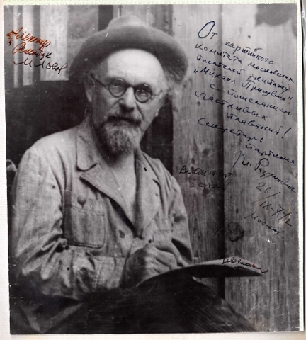 Фотопортрет Пришвина с автографами советских писателей А. Рекенчука, М. Львова, В. Беляева, В. Разумневича с напутствием экипажу контейнеровоза Михаил Пришвин. 26/IX-74 г. Из коллекции Ю.Шпилёва