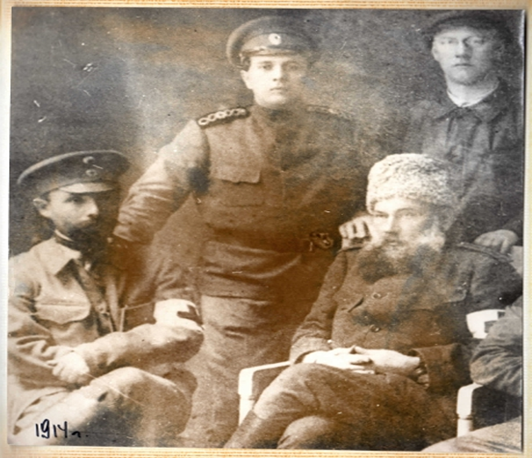 Первая Мировая война. Экспедиция Красного Креста. Дневник 1914 – 1917 (слева на право): сидят М. Пришвин, Илья Львович Толстой (сын А. Н. Толстого) Стоят: неизвестный, Алексей Николаевич Толстой.1914 г. Из коллекции Ю.Шпилёва