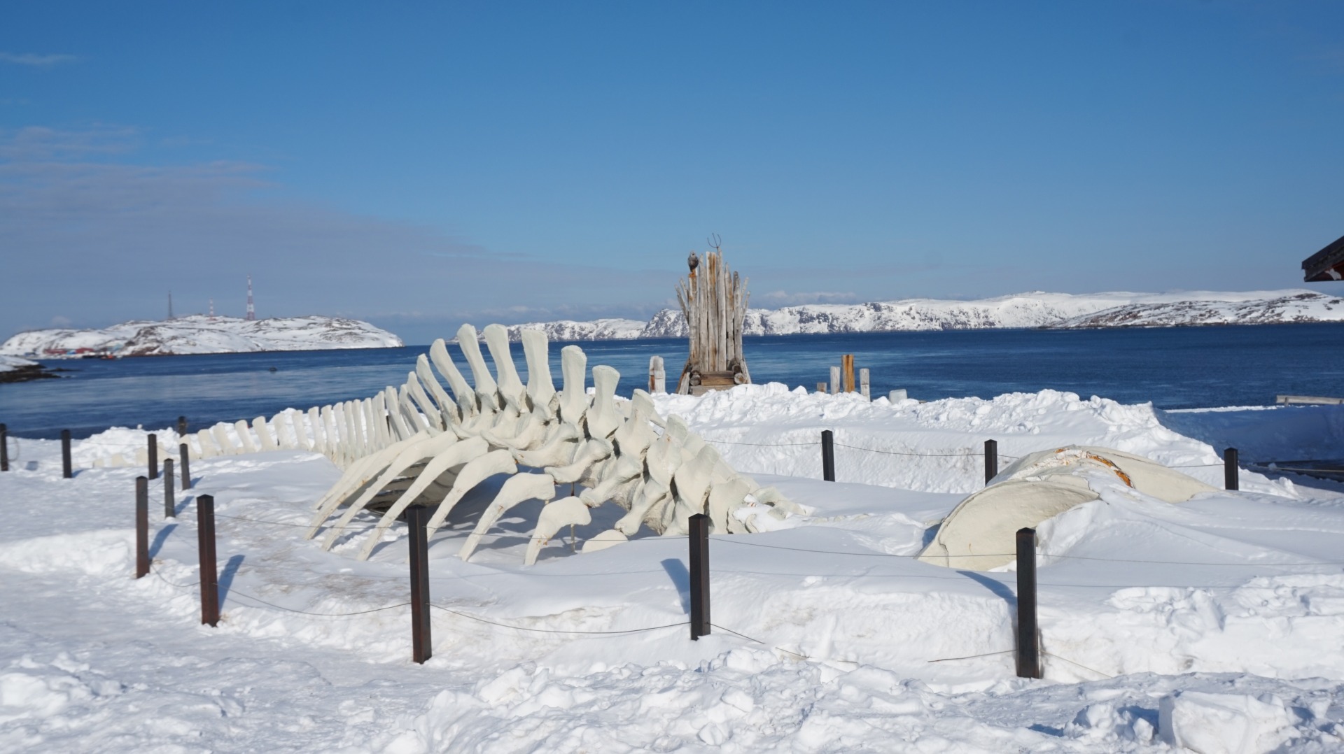 И, наконец, как минимум в двух местах находятся скелеты этих гигантов. Первый – в Старой Териберке, где он остался в память о съемках фильма «Левиафан». Муляж из пластика на металлическом каркасе был изготовлен в натуральную величину. По окончании съемок громоздкую декорацию забрали в Москву, однако спустя время она вернулась обратно. Сегодня скелет синего кита – один из брендов заполярного поселка.