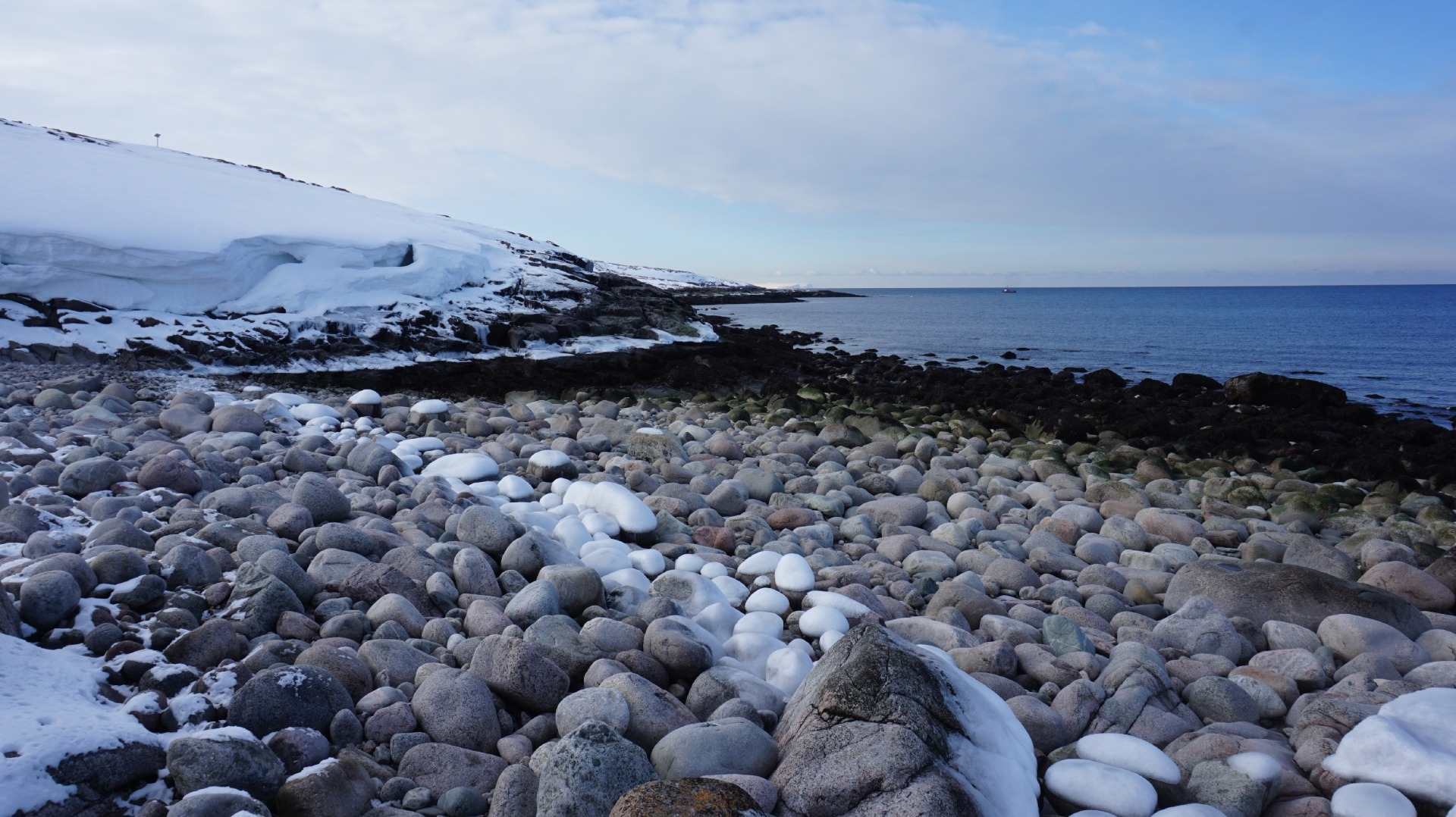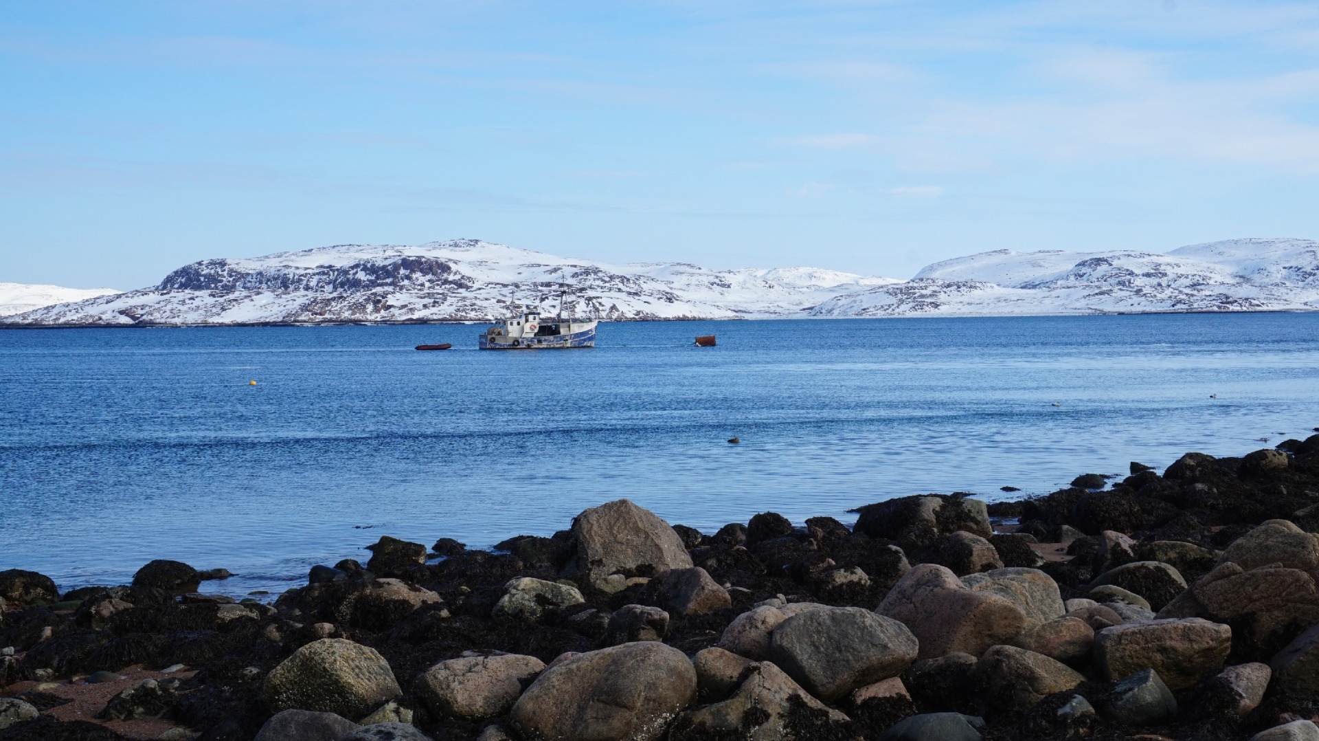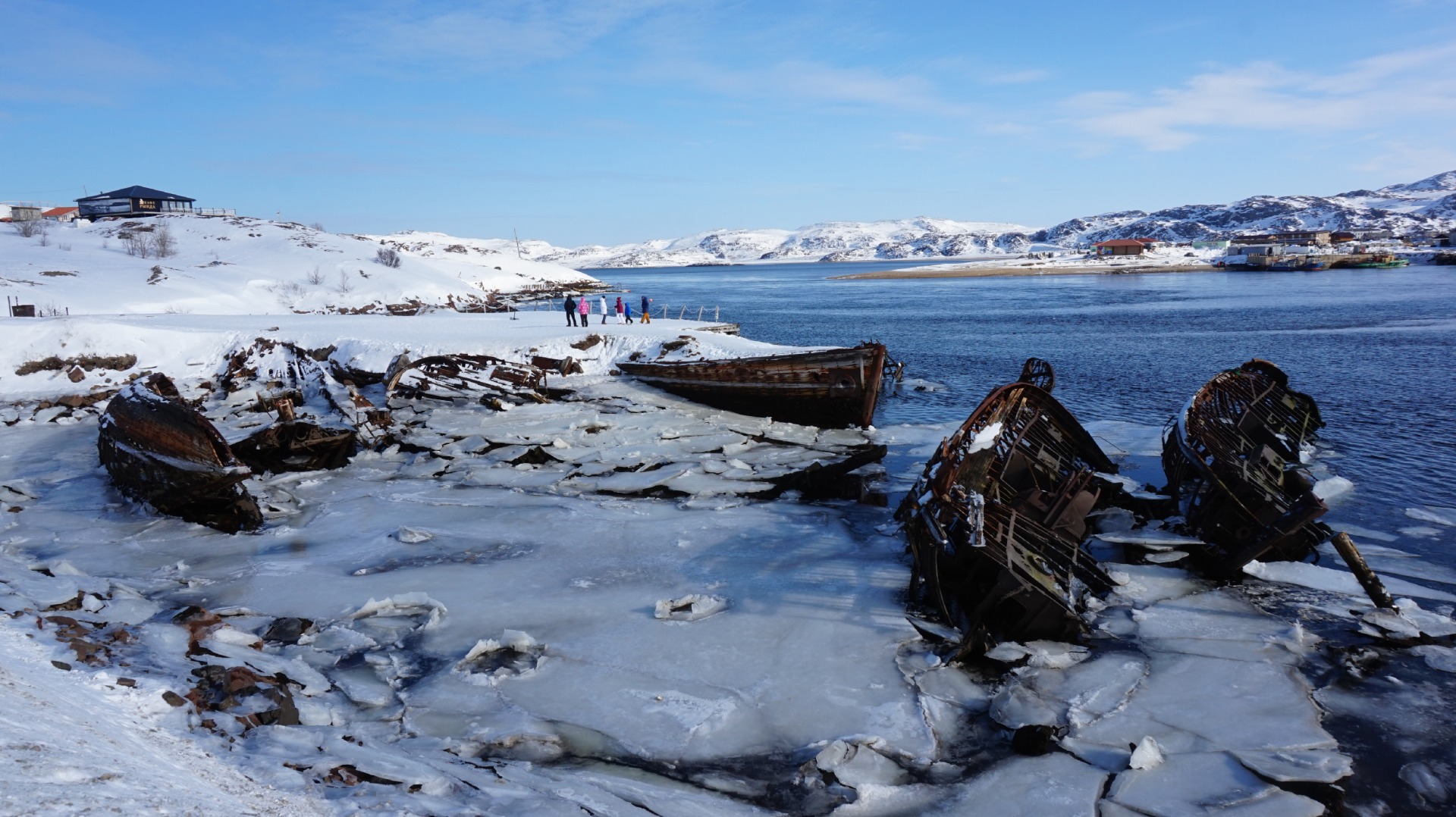 Так, задавая себе вопросы и отвечая на них, не заметили, как преодолели путь. Впереди показалась синяя полоска моря. Заснеженный берег заботливо укрывает невысокие строения. Здравствуй, Териберка!