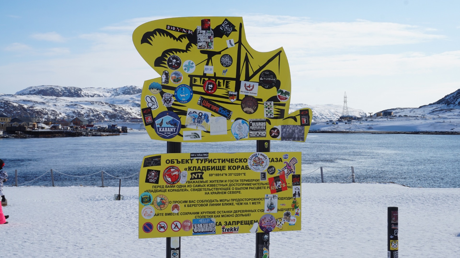 Информационный стенд, заклеенный (в худших териберских традициях) стикерами