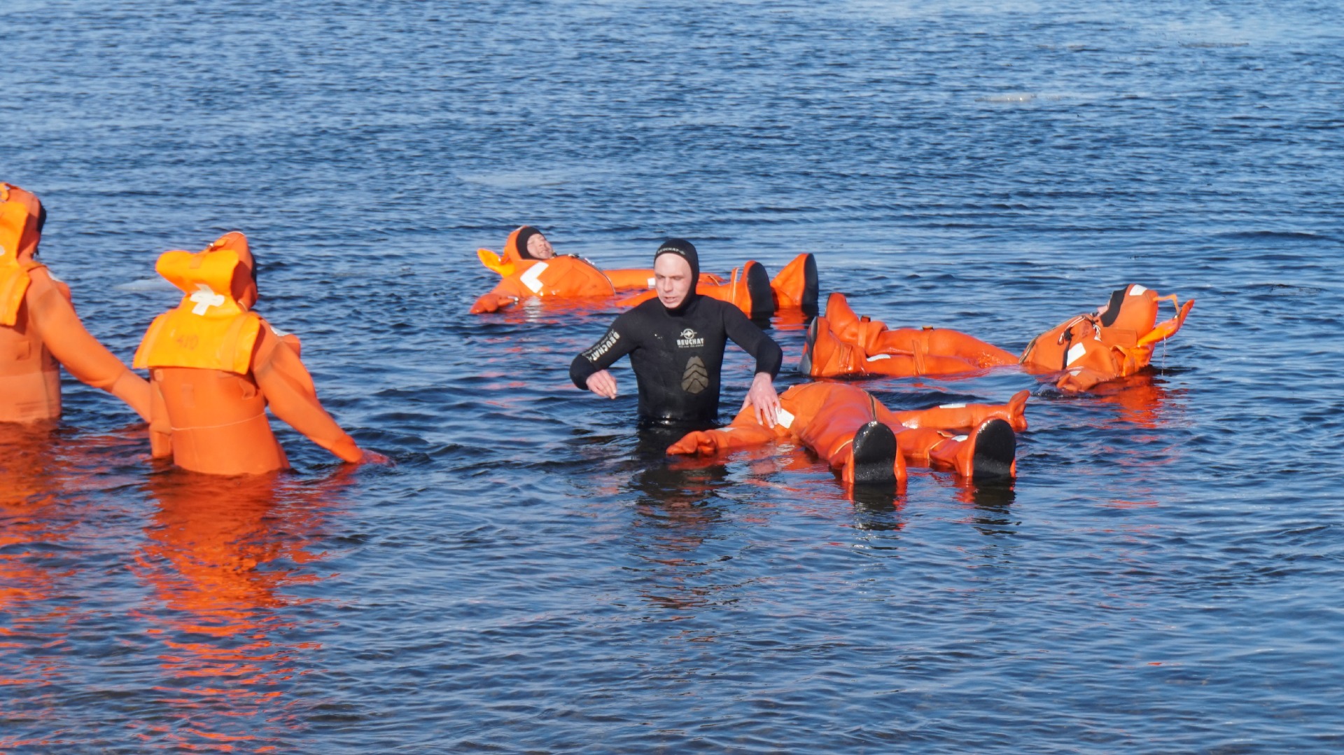 Но – не всем и не всегда. Потому что айс-флоатинг (пребывание в ледяной воде в специальных гидрокостюмах), оказывается, здесь довольно популярен. Застали любопытную картину: люди в чёрном (тренеры) инструктируют людей в оранжевом («курсантов»), готовых изобразить айсберг в океане!
