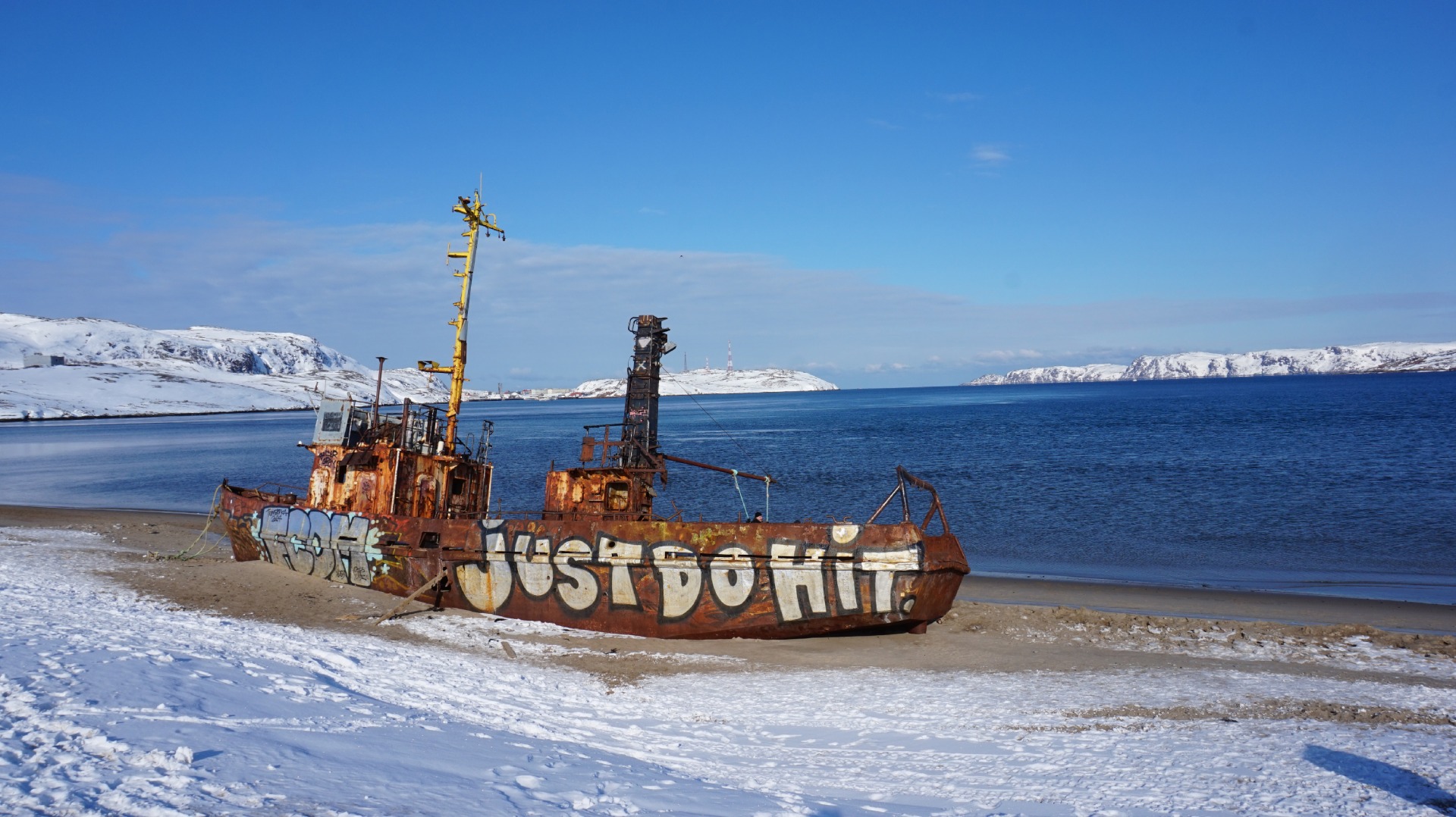 Однако вернемся к пребыванию на суше. Пляж Старой Териберки славится наличием необычных арт-объектов. Упомянем для начала «корабль-призрак» – так иногда называют ржавеющее на берегу судно. Его появление обросло разными мистическими историями, однако правда жизни оказалась прозаичнее: во время сильного шторма в 2020 году на берег выбросило небольшой рыболовецкий траулер. Все ценное оборудование с него сняли, а ржавеющий остов оставили на берегу. Так и стал он невольно еще одним символом забвения в Териберке. Впрочем, безлюдный берег его вид не портит. Скорее, наоборот.