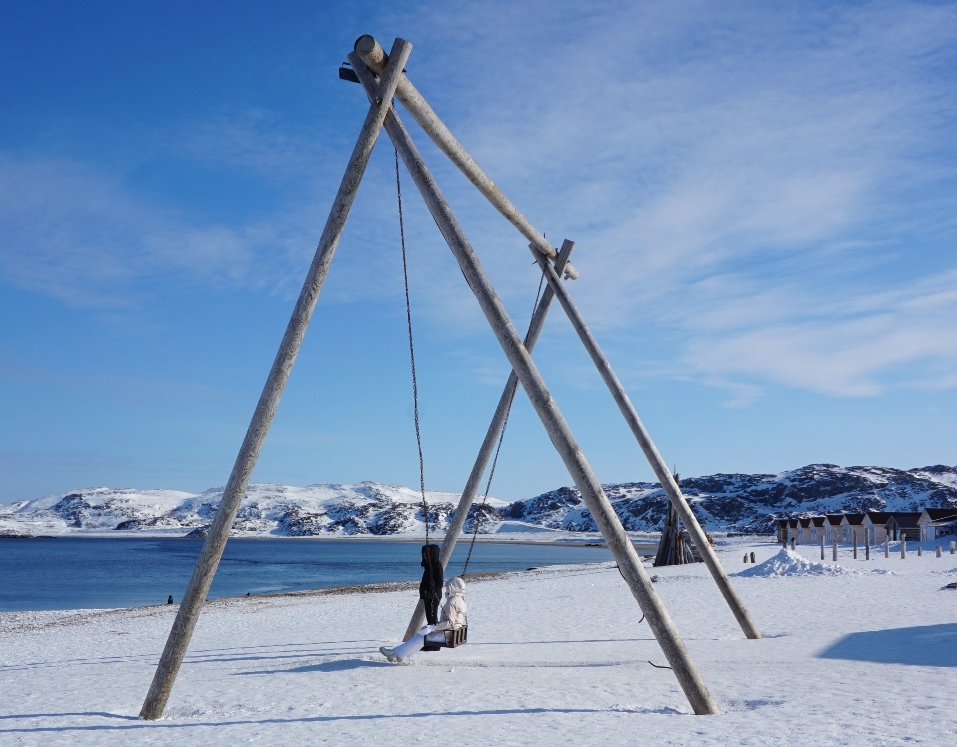 Рядом с арктическими качелями высится деревянный трон. Солидное четырехметровое сооружение из топляка (древесины, долго находившейся в воде и отличающейся повышенной прочностью) было построено в 2021 году для победителя Кубка мира по силовому экстриму. Своим видом оно напоминает трон из известного сериала «Игра престолов». Сегодня тронное место может примерить каждый!