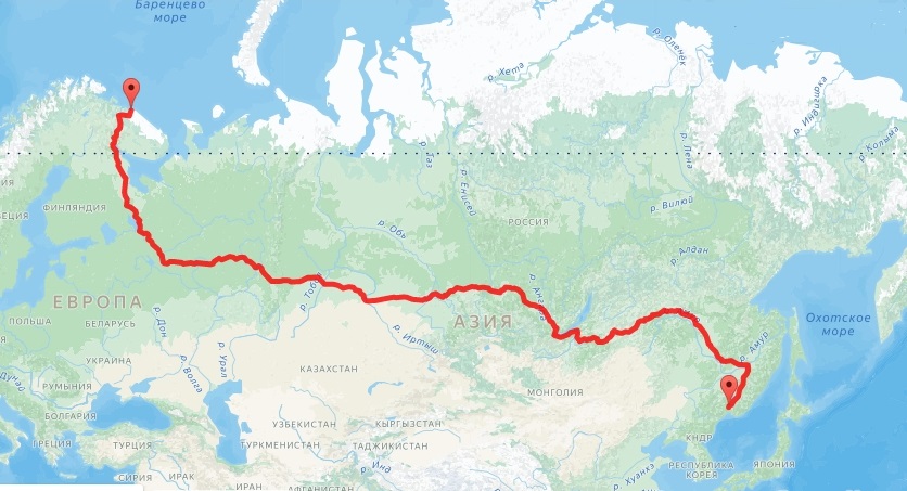 Путь от берегов Тихого океана к берегам Северного Ледовитого не близок. Он пересекает по диагонали территорию нашей страны и имеет протяженность 10 324 километра (четверть окружности экватора). При ежедневном пробеге в 700 км и без транзитных остановок дорога занимает две недели. Или 108 часов непрерывного движения (как бодро заявляют навигаторы).